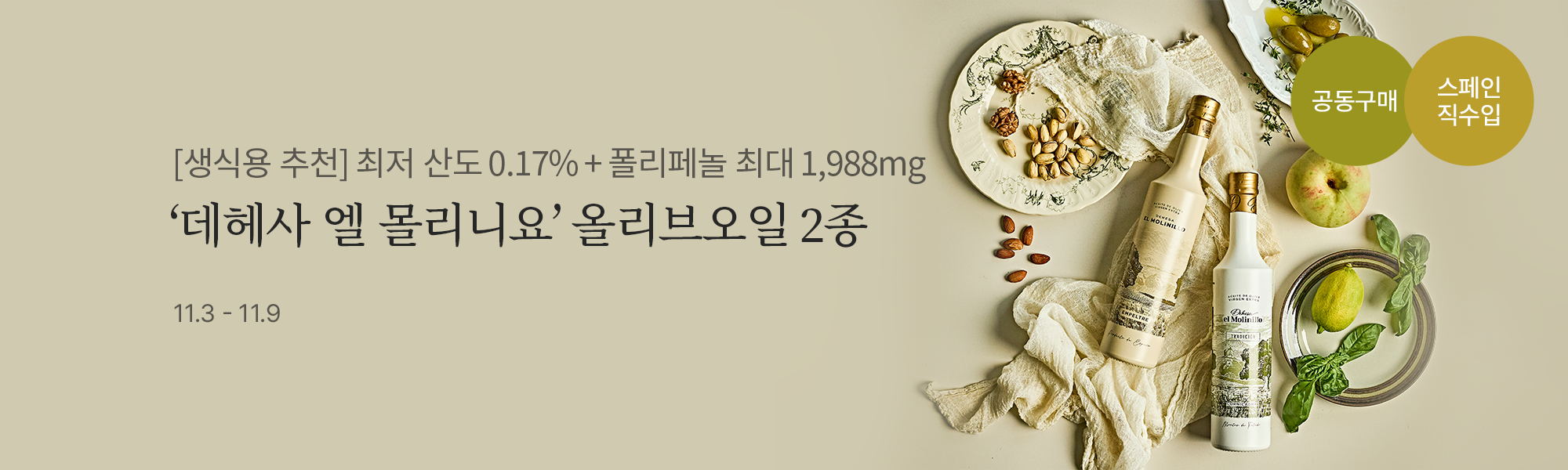 ![[공동구매] 산도 0.17%! 데헤사 엘 몰리니요 올리브오일 (트라디시온/엠펠트레)](https://static.wtable.co.kr/image/production/service/product/54592/ff1039f5-44dd-4bf9-bc64-278f9eeeabc5.jpg?size=500x500)
