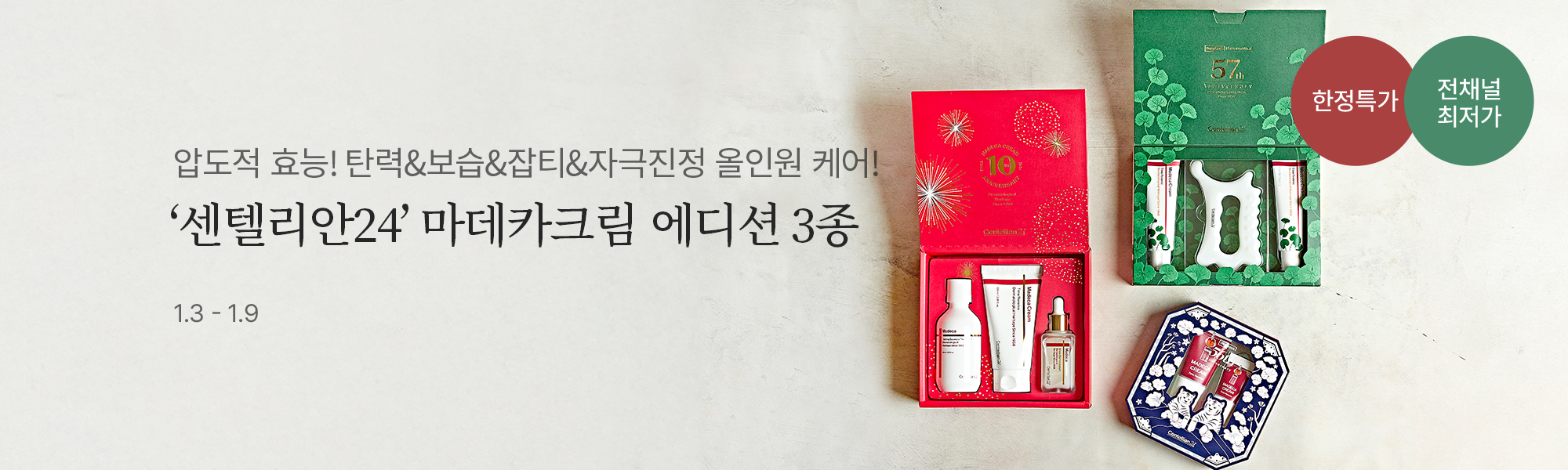 ![[한정특가] '동국제약' 센텔리안24 마데카크림 타임리버스 에디션 모음 (옵션 선택)](https://static.wtable.co.kr/image/production/service/product/55596/fe58360f-6e67-42b4-8b73-d5fbb1a33c24.jpg?size=500x500)