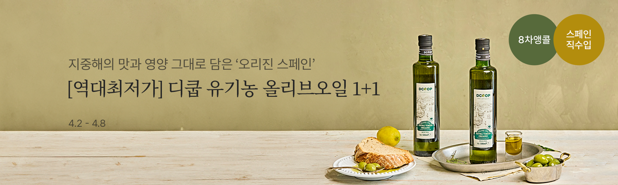 ![[역대최저가] 산도 0.19%! DCOOP 유기농 올리브오일 1+1 (총 1L) + 전원 사은품 증정](https://static.wtable.co.kr/image/production/service/product/47920/7403fab4-57ba-45a2-a634-6784dca8c4b0.jpg?size=500x500)