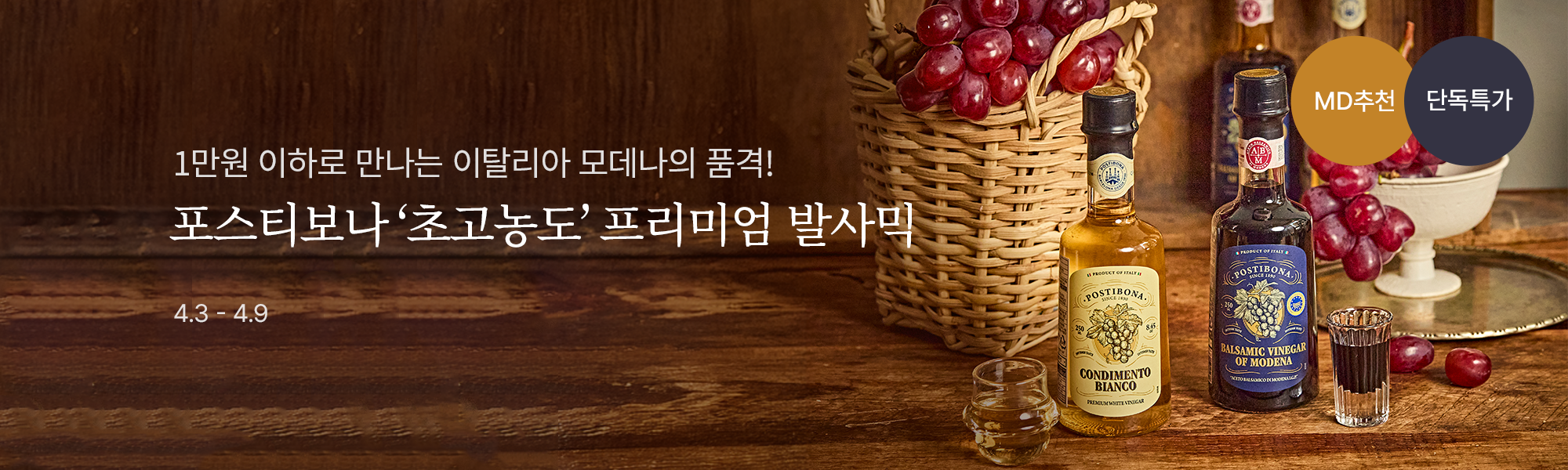![[단독특가] 포도농축액 최대 80%! 초고농도 '포스티보나' 프리미엄 발사믹 1+1 (모데나/화이트)](https://static.wtable.co.kr/image/production/service/product/54962/213cc998-93f9-45cf-bb11-bf4654912aec.jpg?size=500x500)
