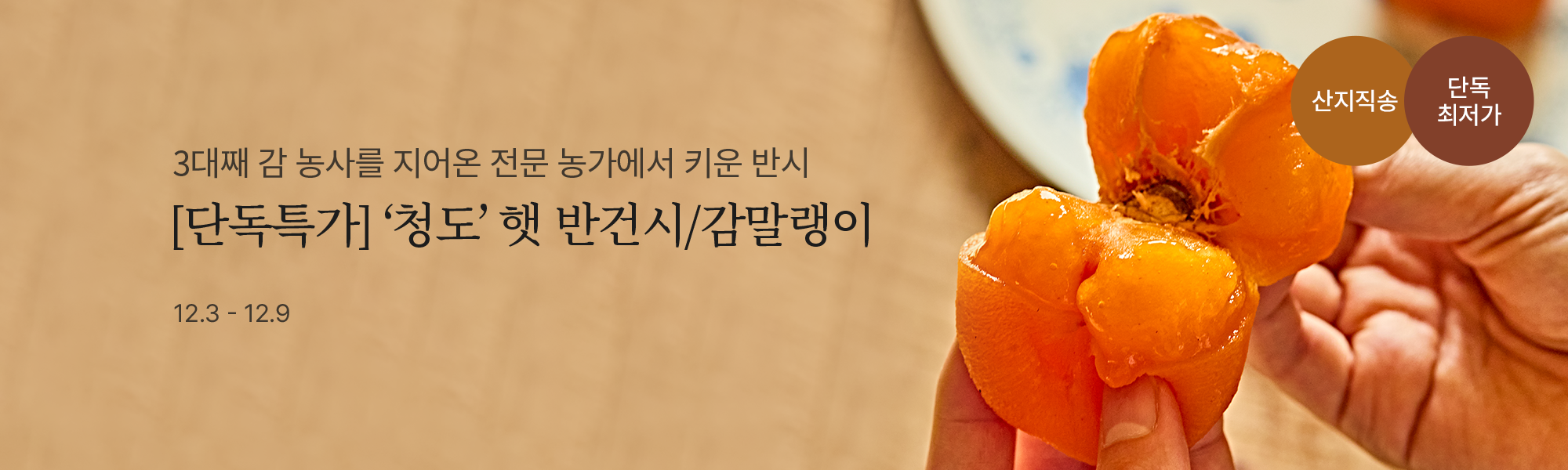 ![[산지직송] 겉쫀속촉! 70년 전통 노하우로만든 달콤함, ‘청도 햇 반건시/감말랭이'](https://static.wtable.co.kr/image/production/service/product/48582/e5093e70-1f4b-4fc4-857b-aaf481b74b0a.jpg?size=500x500)