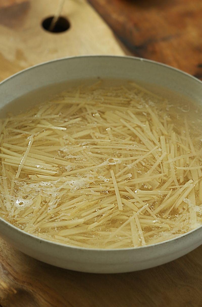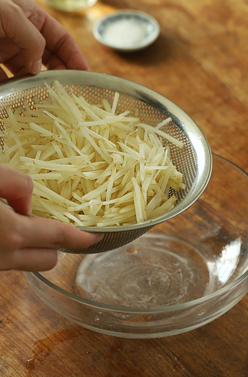 아이들 재우고 남편이랑 맥주 한잔하고 싶을 때. 감자, 밀가루, 소금, 식용유만 있으면 끝나는 감자채 전과 함께 하세요.