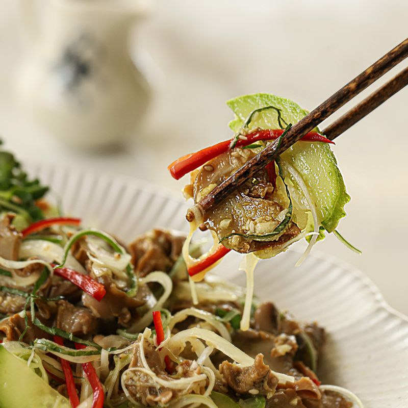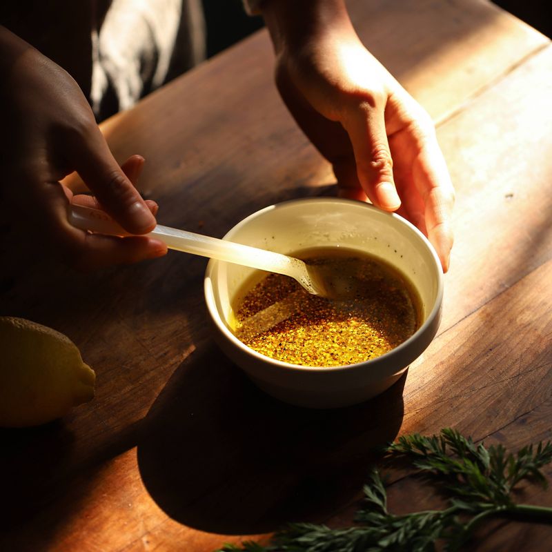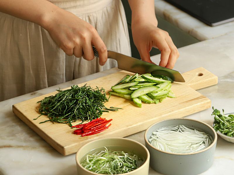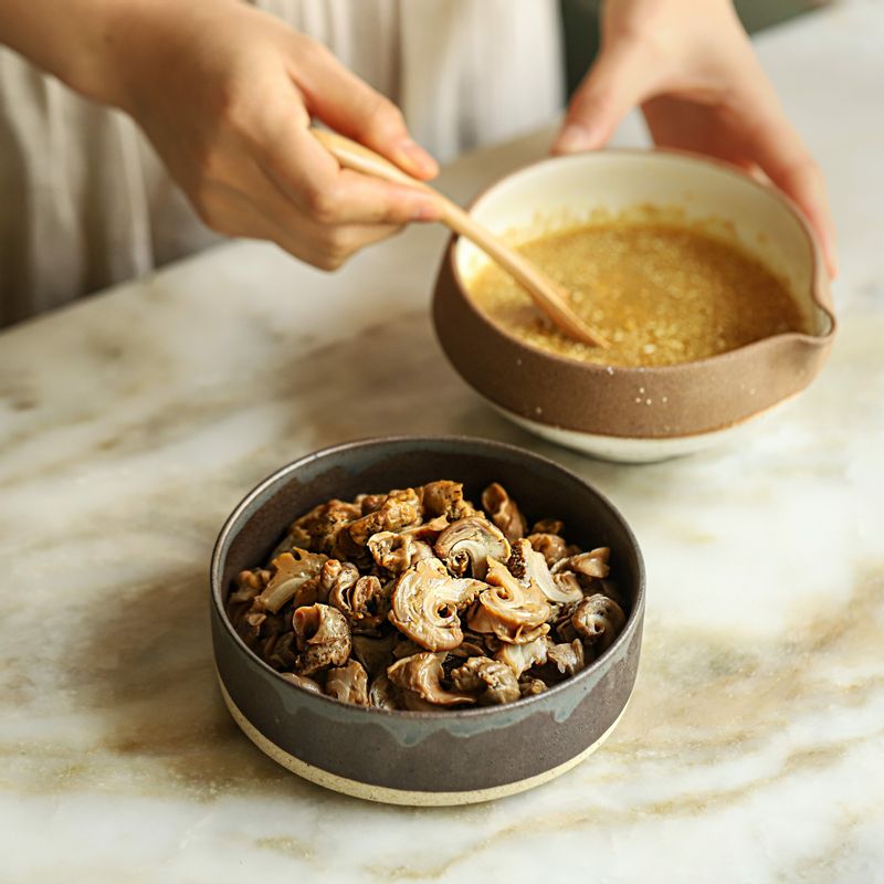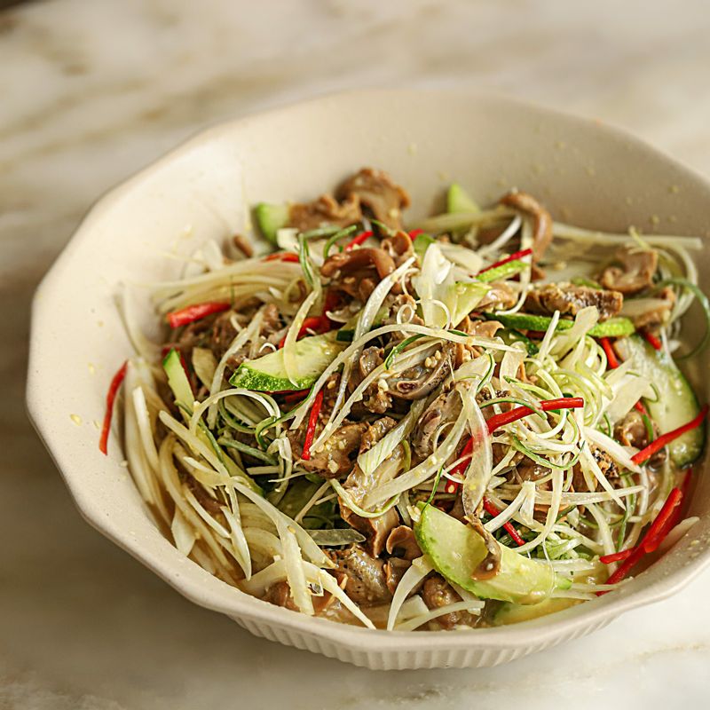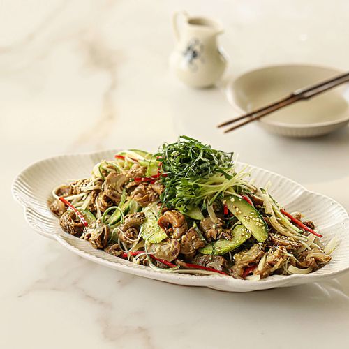 땀 흘릴 필요 없이 산뜻하게 야식 준비하세요. 골뱅이와 채소, 겨자로 만든 톡 쏘는 양념장만 버무려주면 끝이에요.