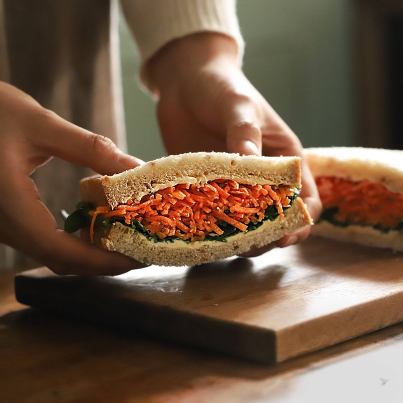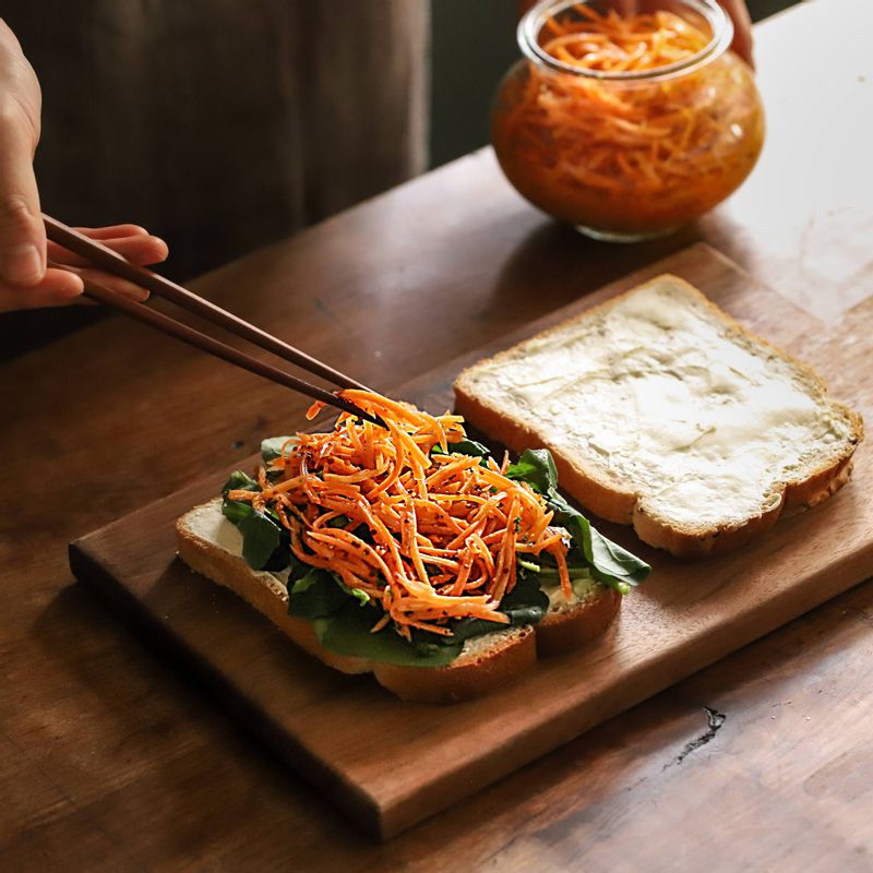 축축한 더위에 에어컨만 쐬고 싶을 때 먹으면 딱 좋은 레시피가 생각났어요! 아삭한 당근에 새콤달콤한 오일드레싱을 버무린 당근라페로 만든 샌드위치인데요. 주말에 당근라페를 미리 만들어 놓으면 샌드위치는 1분컷으로 완성할 수 있죠. (초간단)