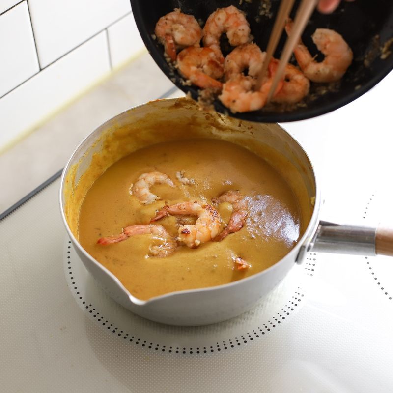 밥 두 그릇 뚝딱 비우게 하는 새우크림카레! 부드러우면서도 진한 카레 위에 버터 향이 듬뿍 느껴지는 새우를 올려 완성했어요.