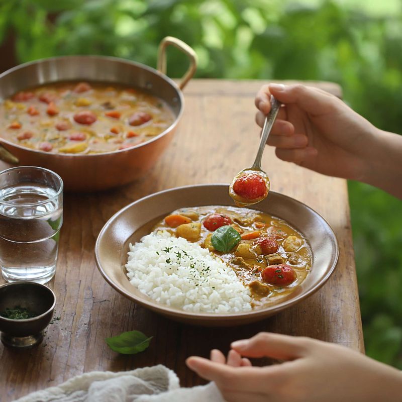 토마토가 들어간 카레는 상상이 안 간다고요? 모르는 소리! 진한 카레에 토마토 토핑을 추가해 가볍고 산뜻하게 즐길 수 있는 카레 한 그릇을 완성했어요.