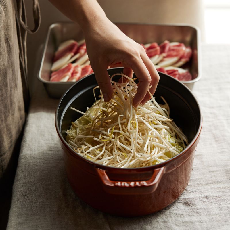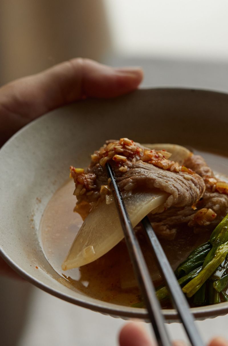무에 차돌박이를 돌돌 말아 자작한 국물과 함께 한입 먹으면, 스트레스가 싹 가신답니다~ 📝TIP 1. 무는 0.2cm 정도 두께로 얇게 썰어야 차돌박이와 함께 익힘 정도가 좋아요. 📝TIP 2. 다시마 육수를 배추와 숙주가 자작하게 잠길 만큼 넣고 끓여주세요.