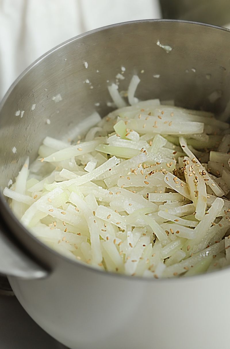 밥반찬은 물론, 비빔밥으로 활용해도 맛있는 무나물볶음 하나면 오늘 저녁 걱정 없어요! 📝TIP 1. 무는 결 방향대로 썰어 볶으면 쉽게 부서지지 않아요. 📝TIP 2. 기호에 따라 국물이 자작하게 만들고 싶다면 멸치 다시다 육수 양을 조절해 주세요.