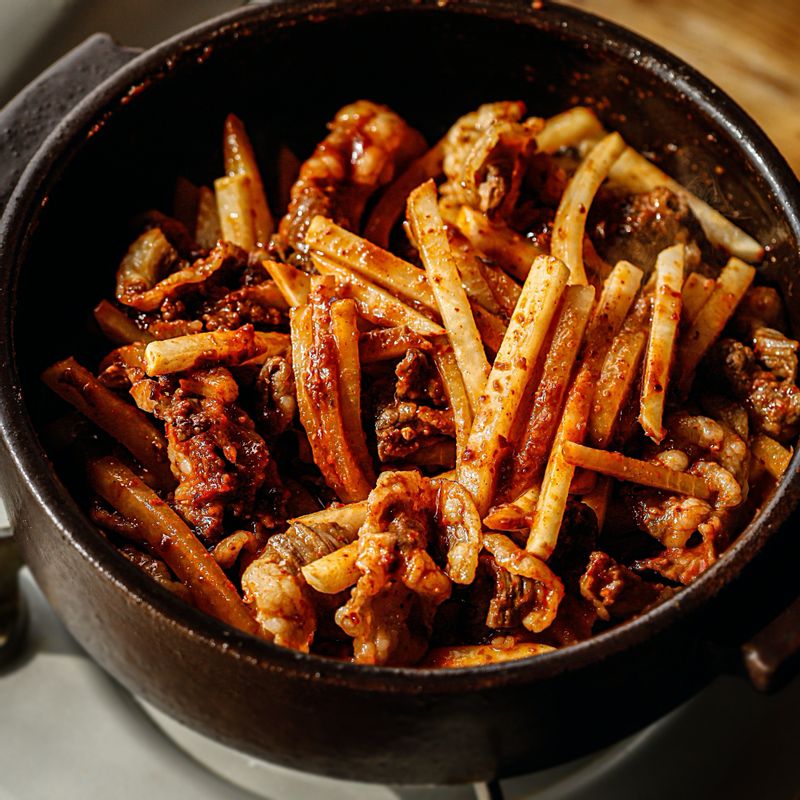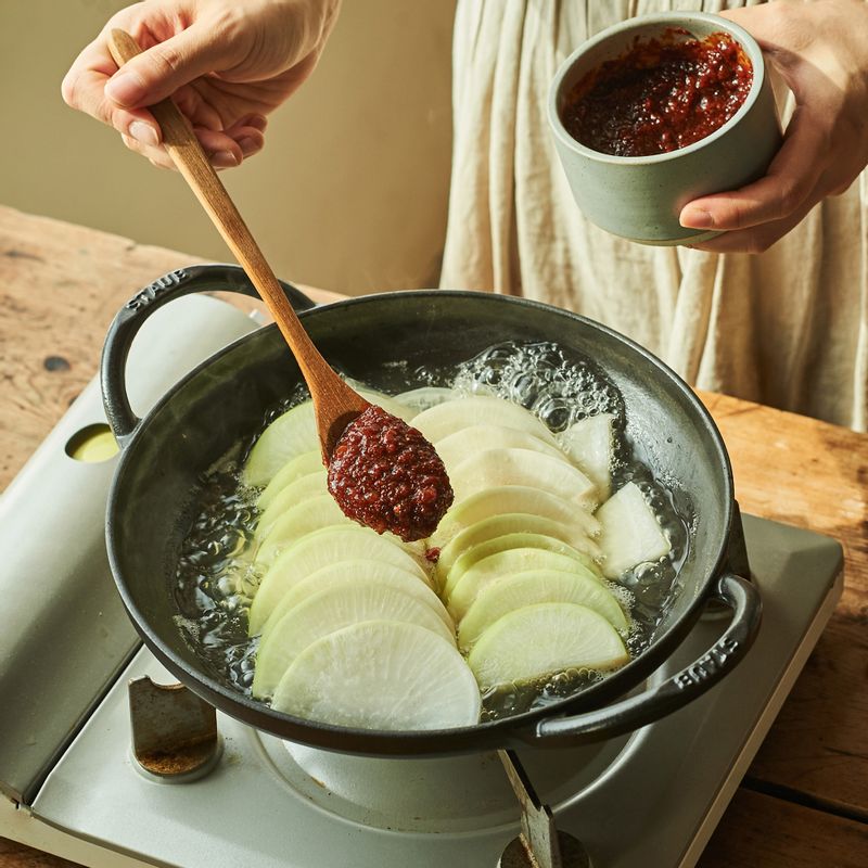 입맛 도는 짭조름함에 언제나 인기 좋은 무 짜글이! 매콤하고 달달한 된장 양념에 푹~ 부드럽게 익은 무와 고소한 차돌박이의 궁합이 참 잘 어울려요.