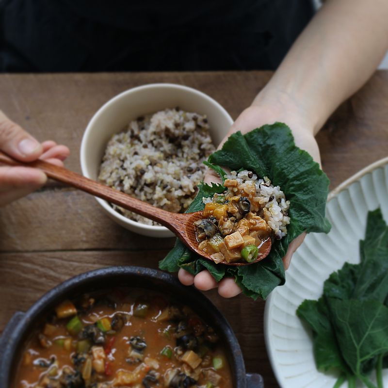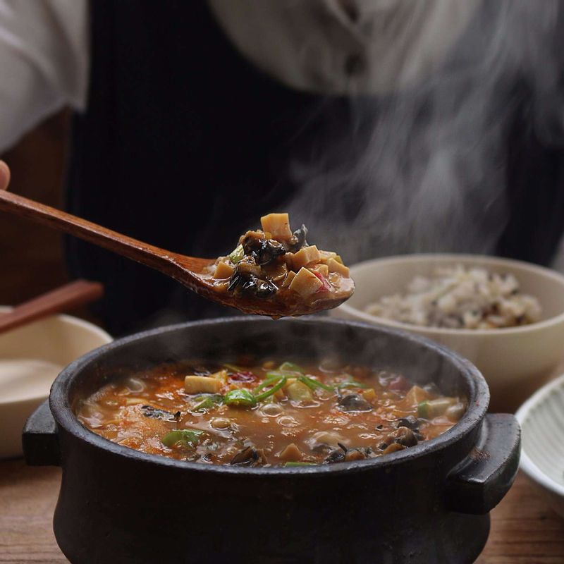 진하고 구수한 향부터 밥을 부르는 우렁이강된장! 쫄깃한 식감의 우렁이를 듬뿍 넣어 맛깔나게 즐길 수 있는 메뉴예요. 간 해독에도 좋고 골다공증 예방에도 좋은 우렁이를 활용해 건강에 좋은 한 끼를 완성했답니다.