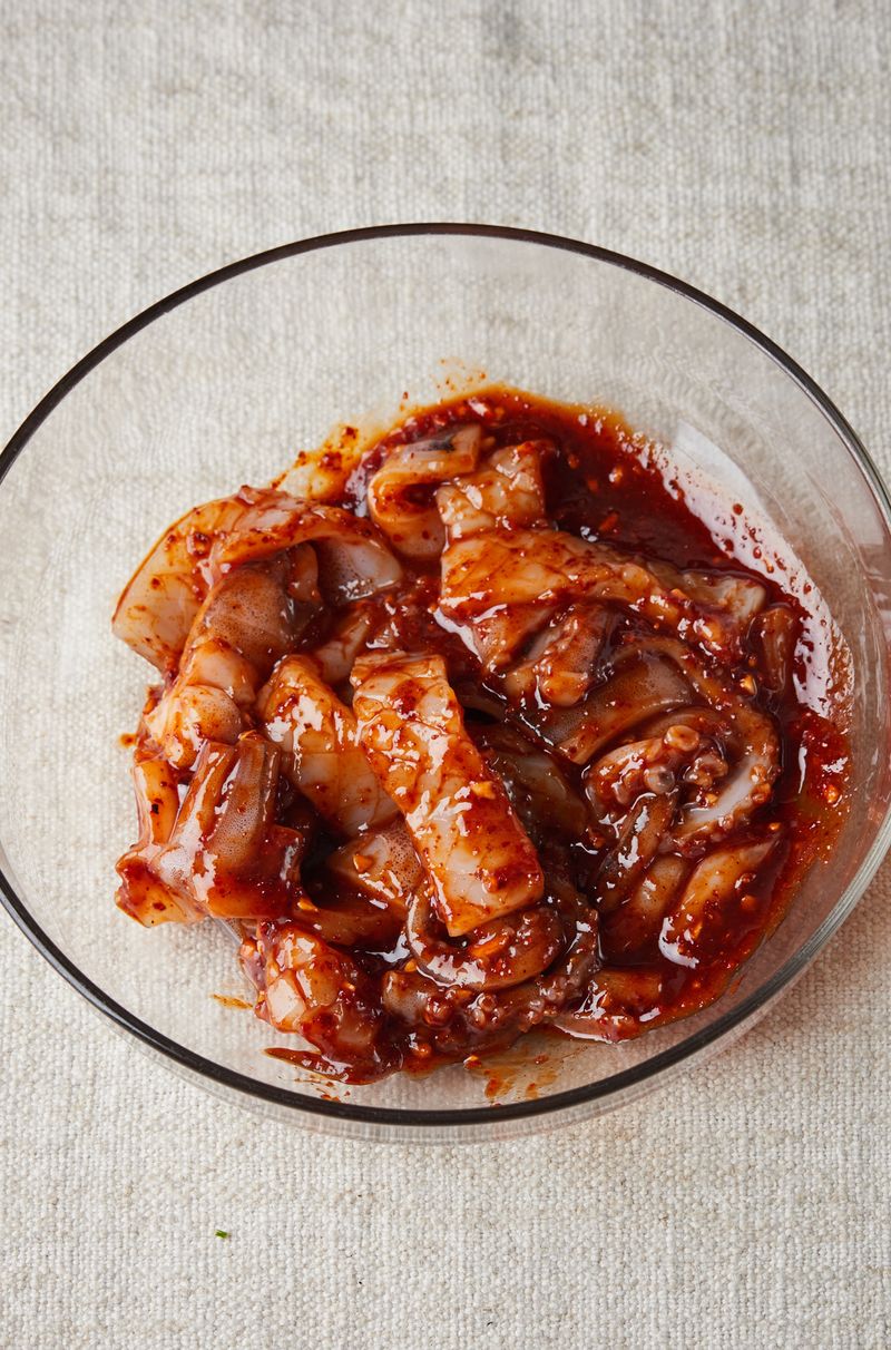 신선한 쌈 채소 위에 재료를 하나씩 올려 한입 가득! 먹어도 맛있고, 밥을 넣고 볶아 짭조롬하게 먹어도 꿀맛이랍니다! 📝TIP 1. 손질한 오징어에 청주를 넣으면 오징어 비린내 제거에 효과적이에요.