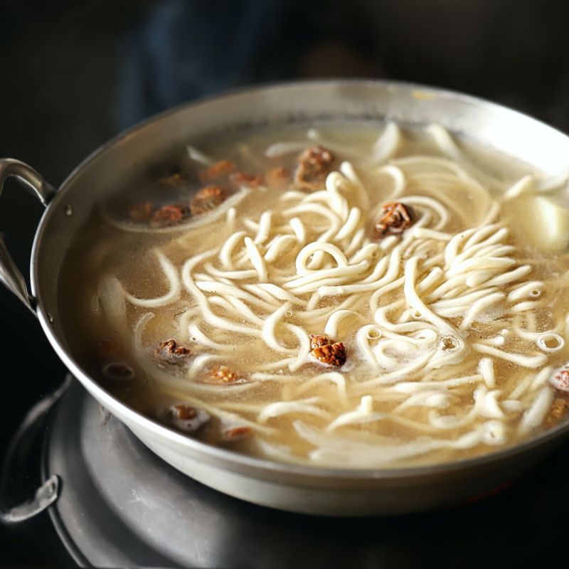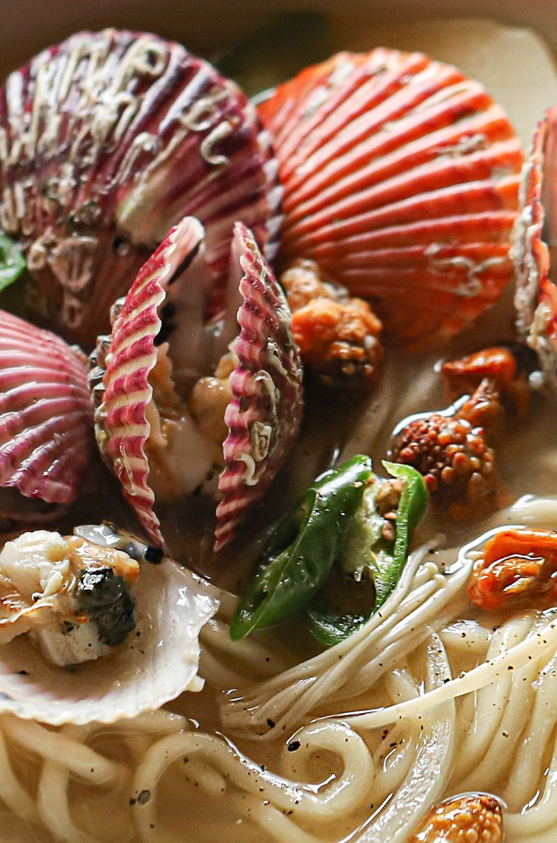 담백하면서 독특한 풍미가 있는 가리비로 깊은 감칠맛을 낸 가리비칼국수! 시원한 국물과 오동통한 면 위에 갓 담은 신선한 김치를 톡 올려 호로록 먹으면 이게 바로 행복이에요~