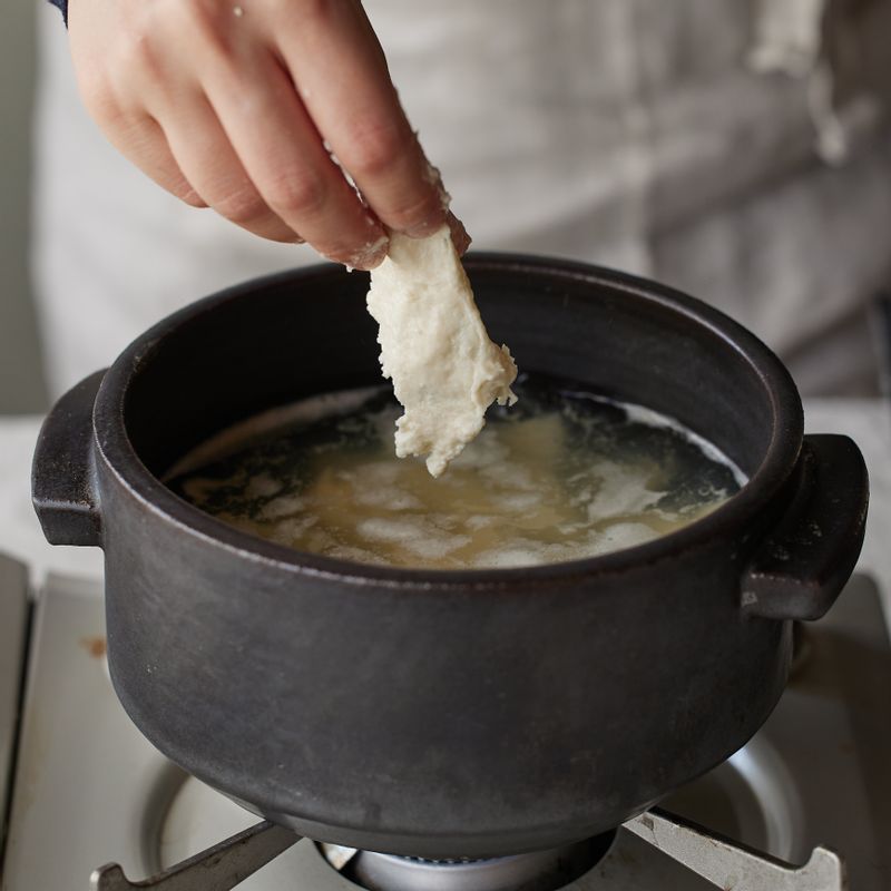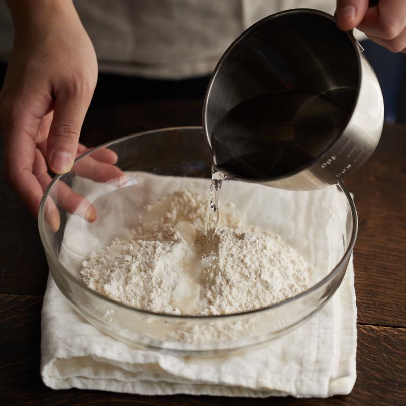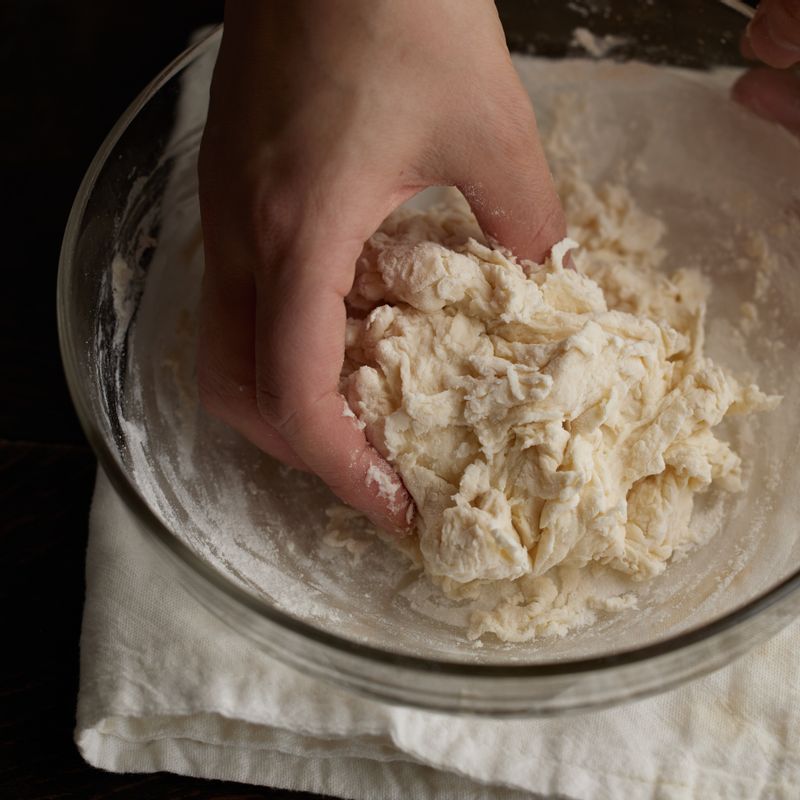 📝TIP 1. 약간 진 느낌으로 손에 달라붙는 정도의 반죽 상태가 딱 좋아요. 📝TIP 2. 반죽은 냉장고에서 하루 정도 숙성시키면 더 얇게 뜯을 수 있어요.