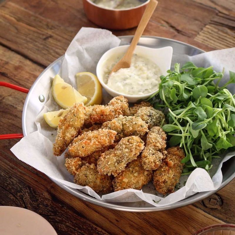 기호에 따라 새콤달콤한 깐풍소스나 부드러운 타르타르 소스에 찍어 즐겨보세요! 📝TIP 1. 담백하게 만들고 싶다면 에어프라이어에 조리해도 충분히 맛있어요. 📝TIP 2. 타르타르소 소스에 유자청 대신 올리고당을 넣어 만들어도 괜찮아요.