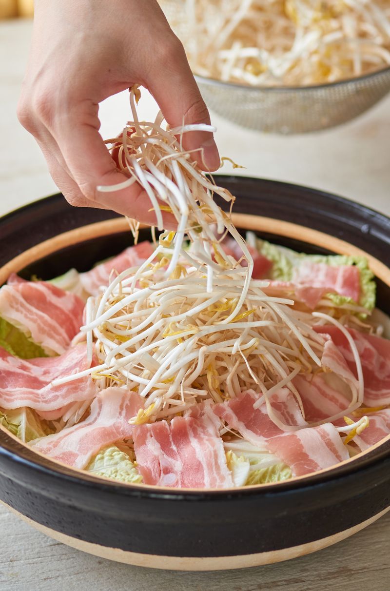 연말을 맞아 뜨끈~한 요리가 필요할 때 만들기 좋은 삼겹살 배추술찜! 알배추와 숙주, 삼겹살을 켜켜이 돌려 담고 화이트 와인을 넣어 풍미를 더했어요. 재료 본연의 수분 덕분에 느끼함 없이 담백함을 한껏 느낄 수 있는 요리랍니다.