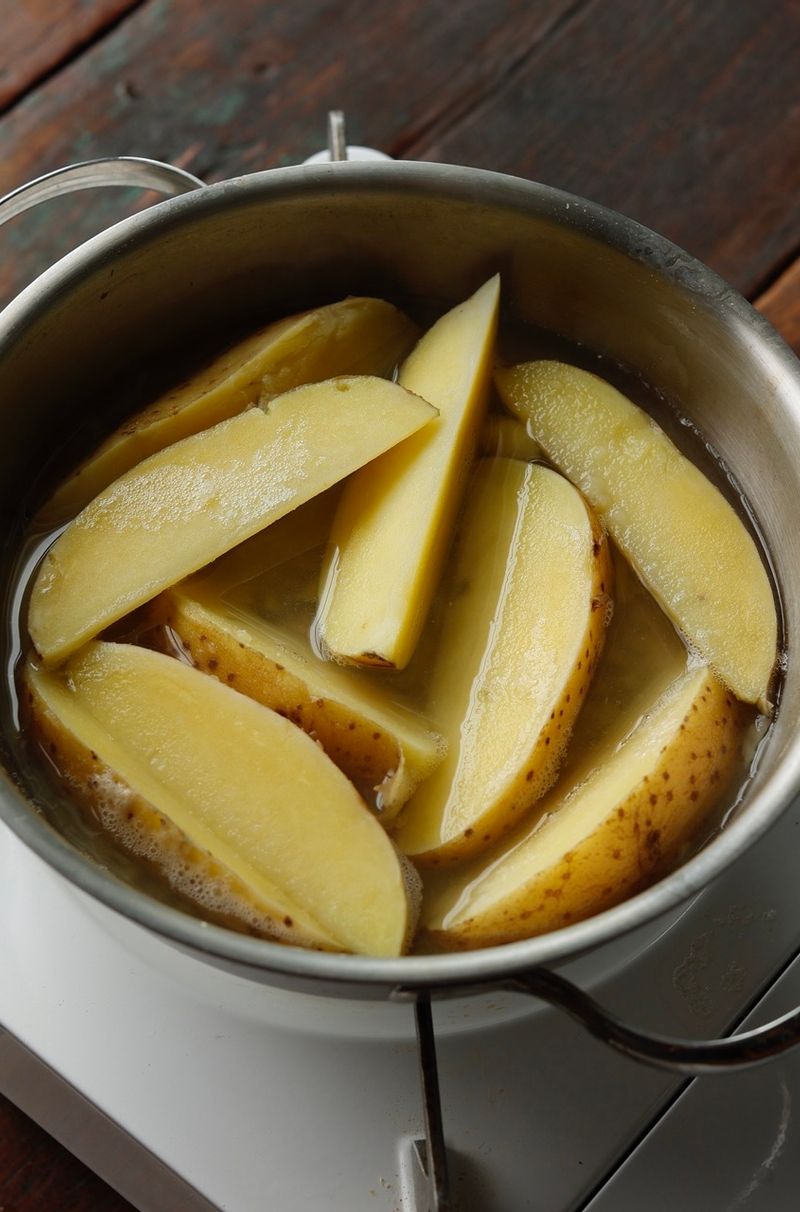 두툼한 웨지감자에 케찹이나 치즈 소스까지 곁들이면 어느 호프집 부럽지 않은 요리를 완성할 수 있답니다. 📝TIP 1. 전자레인지 용기에 감자와 물을 살짝 넣고 조리해 익혀줘도 좋아요. 📝TIP 2. 기름에 튀겨 식힌 후 한 번 더 센 온도에서 튀겨주면 더욱 바삭해요.