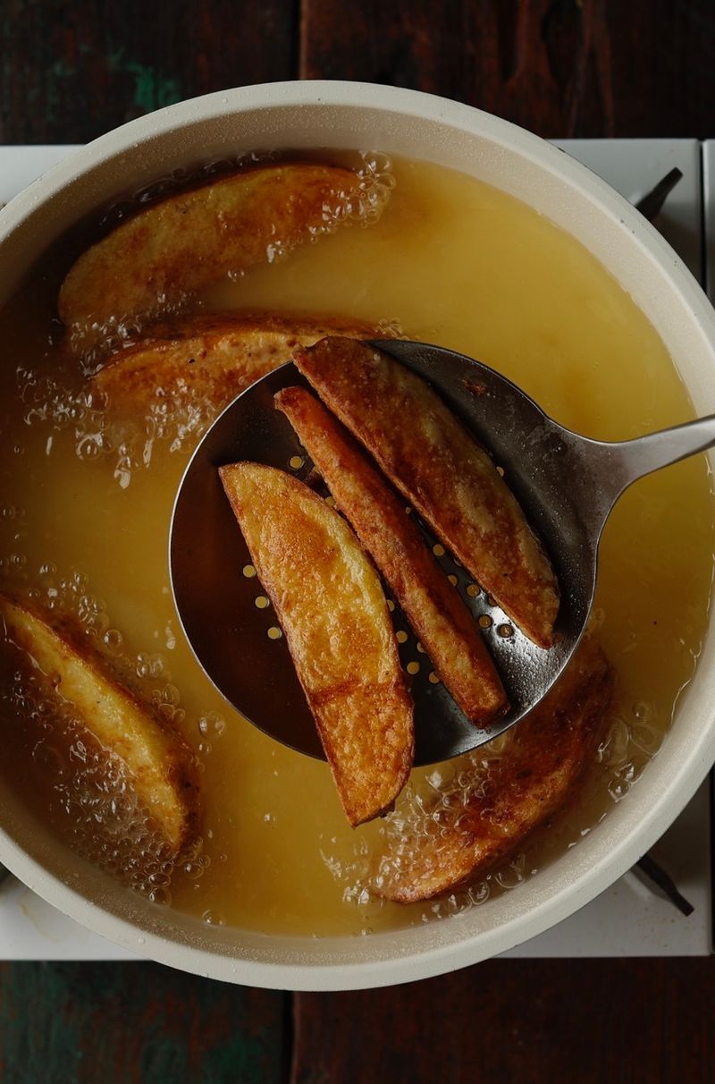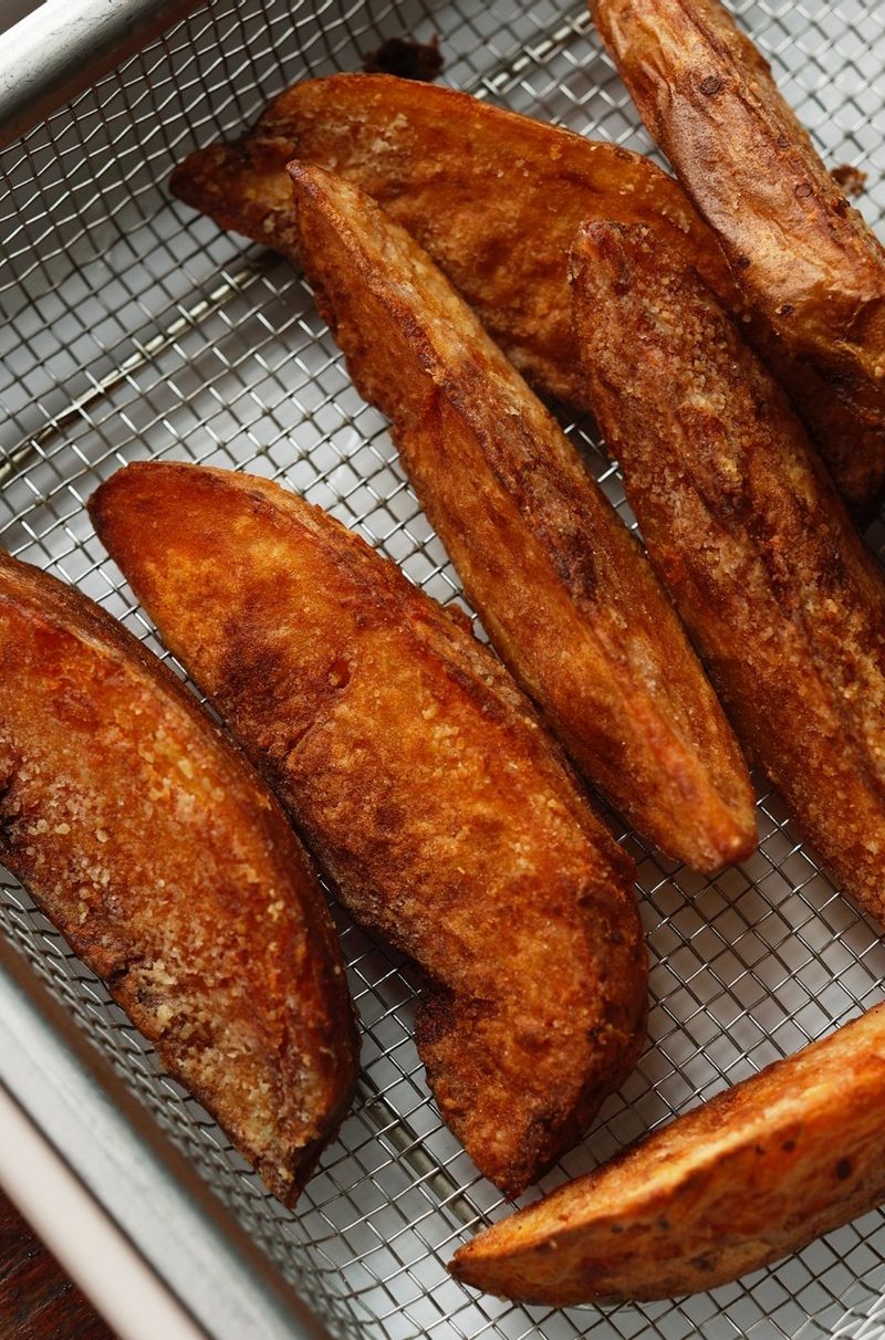 핑거푸드로 먹기 딱 좋은 웨지감자튀김! 소소한 홈파티 분위기에 잘 어울리는 요리 하나 고민될 때 이거 한번 만들어 보세요. 감자를 굵게 썰어 바삭하게 튀기기만 하면 돼요.