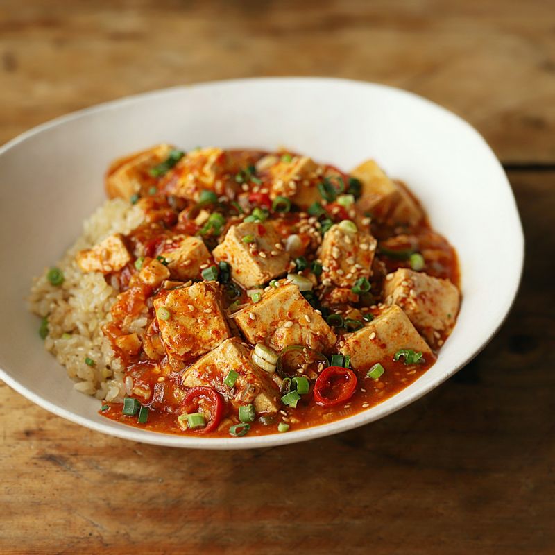 고기 없이 깔끔하고 담백한 맛이 매력인 채식 마파두부 덮밥! 고추기름으로 식욕을 돋우는 감칠맛을 내 여러 반찬 필요 없이 밥 한 공기 싹! 비울 수 있을 거예요.