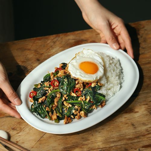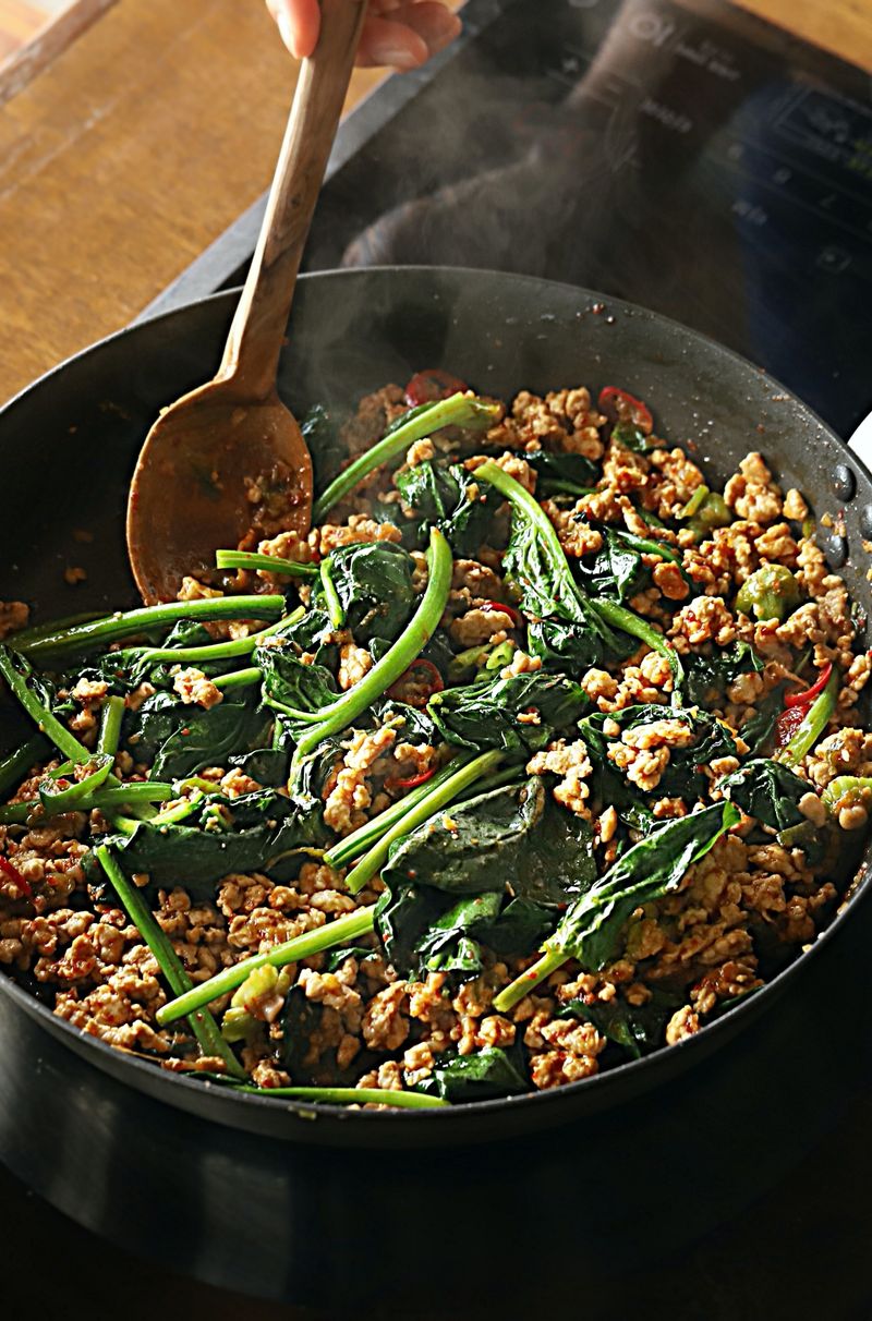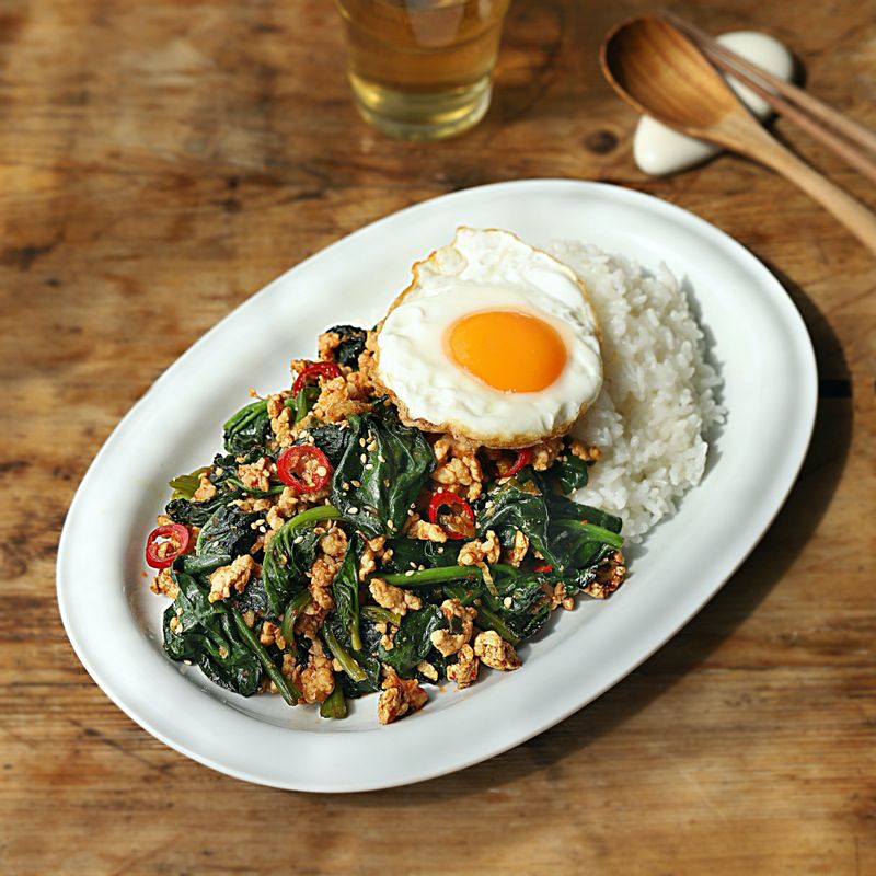 시금치는 특히 밥과 정말 잘 어우러지는 식재료예요. 그런 시금치로 만드는 뻔하지 않은 태국식 덮밥! 돼지고기의 감칠맛이 맴도는 매콤한 간장 소스가 시금치와 잘 어우러져 자꾸 당기는 매력이 있어요.