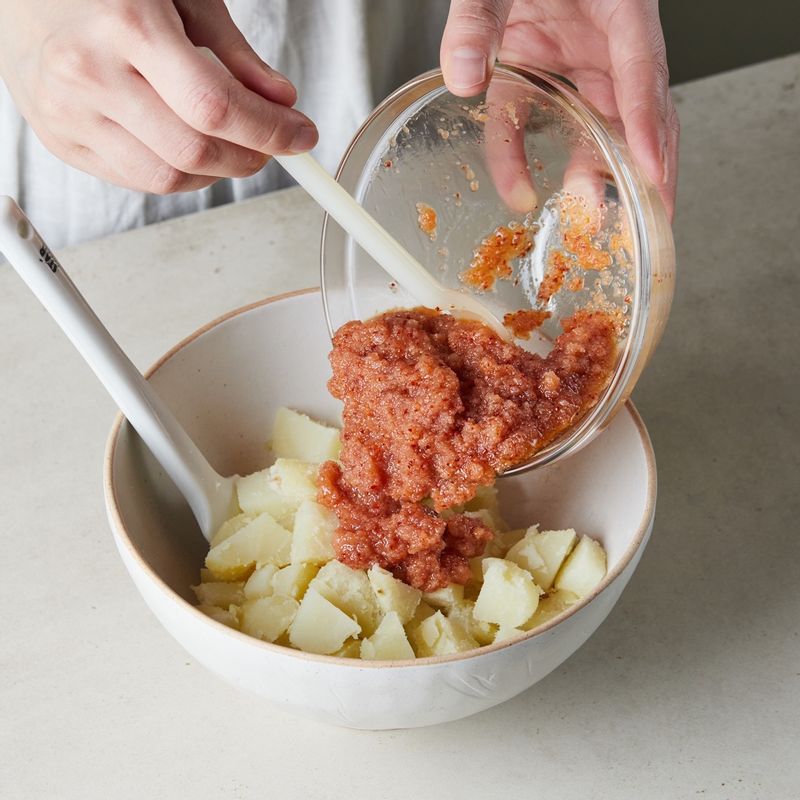 📝TIP 1. 명란을 반으로 갈라 칼 등으로 살살 긁으면 껍질을 제거하기 수월해요. 📝TIP 2. 삶은 감자가 약간 식은 후 명란과 섞어줘야 비린내가 나지 않아요. 📝TIP 3. 취향에 따라 명란의 양을 조절해 간을 가감해 주세요.