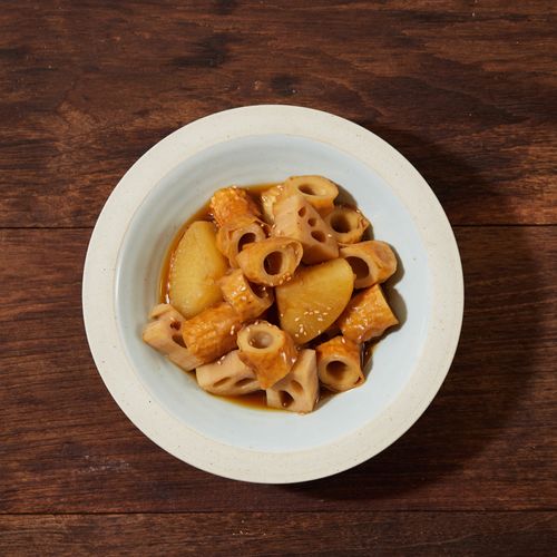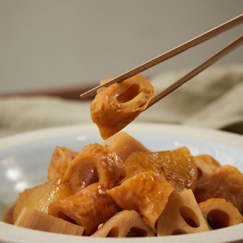쯔유 양념의 짭조름한 감칠맛이 매력인 연근 어묵조림! 아삭한 연근과 쫄깃한 어묵의 상반된 식감 덕분에 먹는 내내 재밌는 반찬이에요. 취향에 맞는 어묵을 골라 만들 수 있어 인기가 좋답니다.