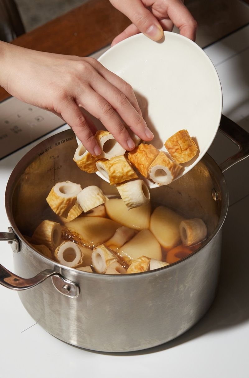 📝TIP 1. 생강은 어묵과 연근의 잡내를 제거해 줘요. 생강이 없다면 생략해도 괜찮아요. 📝TIP 2. 기호에 따라 당근이나 감자와 같은 채소를 넣어줘도 좋아요.
