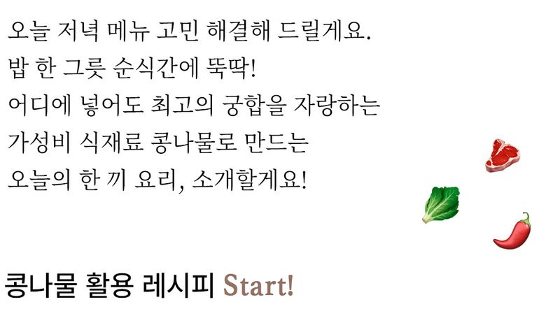 콩나물의 새로운 매력을 느낄 수 있는 요리로 한 끼를 든든하게 채워보세요! 📝TIP 1. 밥 위에 올린 후, 채소를 곁들여 비빔밥으로 만들어 먹어도 정말 잘 어울려요. 📝TIP 2. 밥반찬으로 곁들이려면 평소보다 양념의 간을 조금 더 세게 잡아주세요.