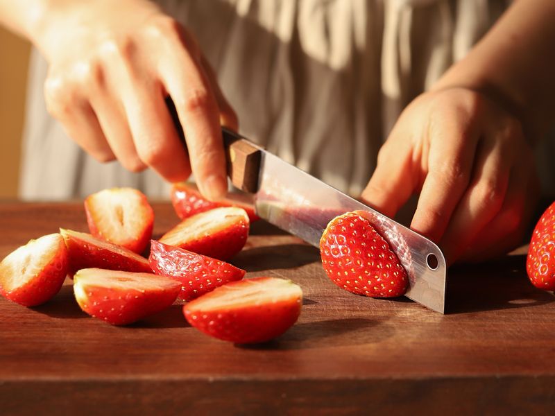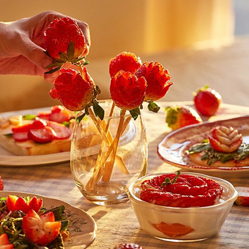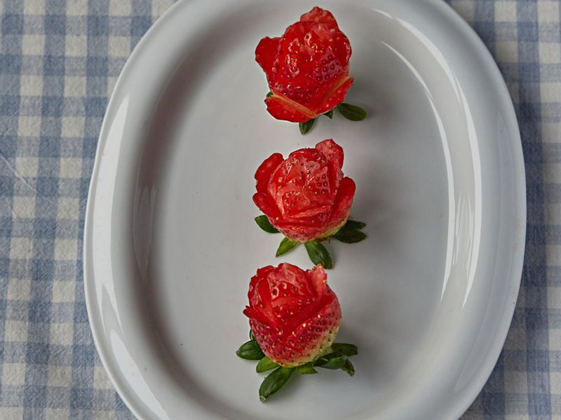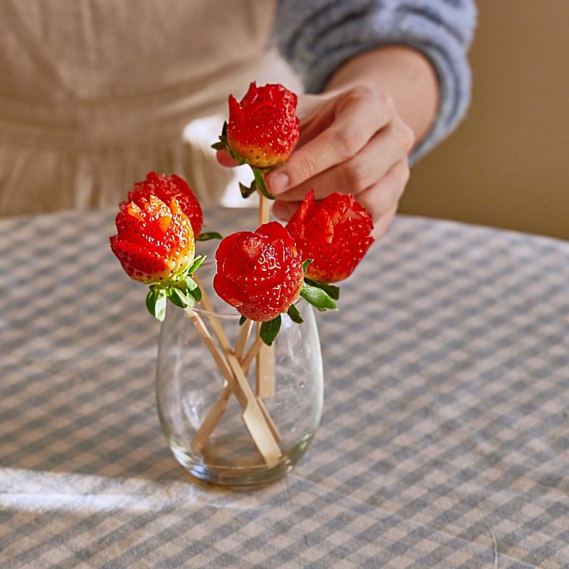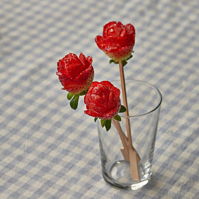 1. 장미꽃 모양으로 자르기 ① 딸기는 꼭지를 떼지 않은 상태로 깨끗이 씻고 나무 꼬치를 꽂은 후 밑동에서 2미리 정도 남겨두고 바깥쪽부터 다섯 장의 꽃잎을 만들어주세요. ② 다섯 장의 꽃잎 사이 안쪽에 칼집을 넣어 다시 다섯 장의 꽃잎을 만들어 살짝 꽃잎을 펴 주세요. ③ 맨 위에 딸기가 작아 공간이 작으면 삼각형으로 칼집을 넣어 준 후 꽃잎을 살짝 펴 주세요. 2. 동그랗게 잘라 꽃 모양으로 만들기 ① 딸기는 깨끗이 씻고 꼭지를 뗀 후 딸기 끝부분을 약간만 잘라 내 주세요. ② 딸기를 가로로 놓고 동그랗게 일정한 두께로 슬라이스해 주세요. ③ 동그랗게 자른 딸기를 꽃 모양으로 돌려놓고 가운데 딸기 끝부분을 얹어주세요. 👇🏻더 많은 팁은 아래 링크를 클릭해 확인해보세요!