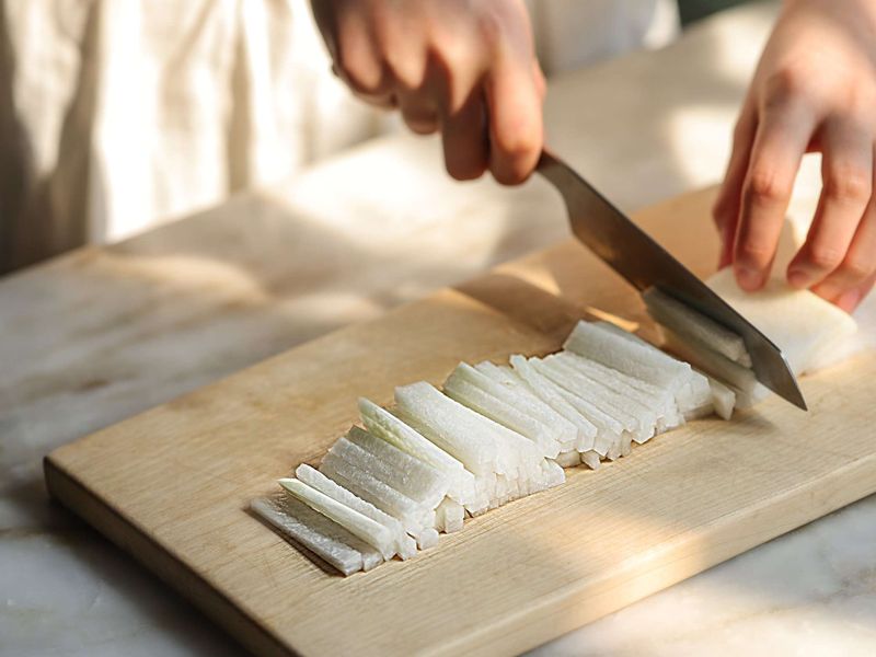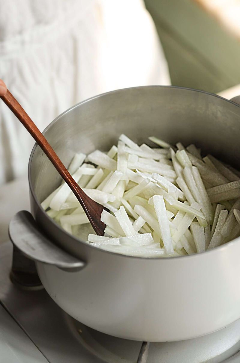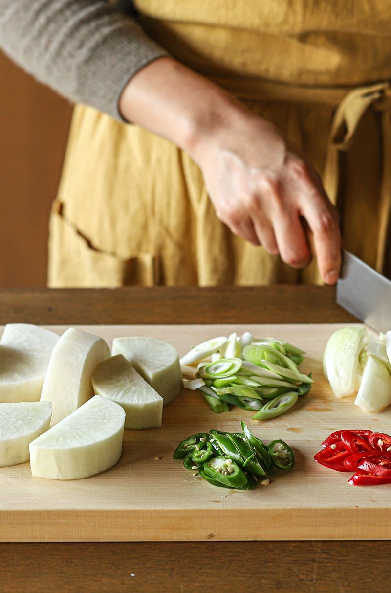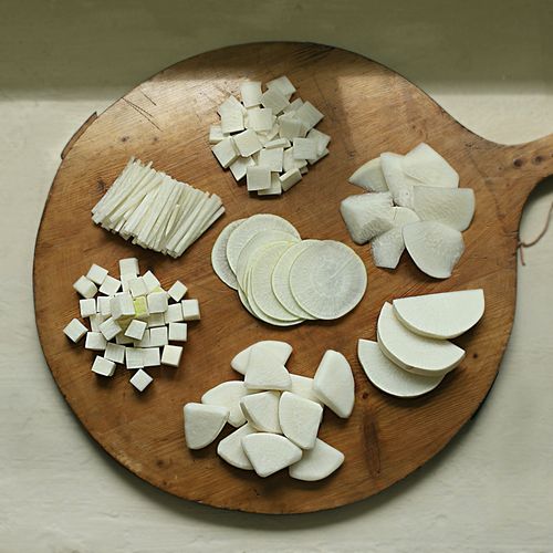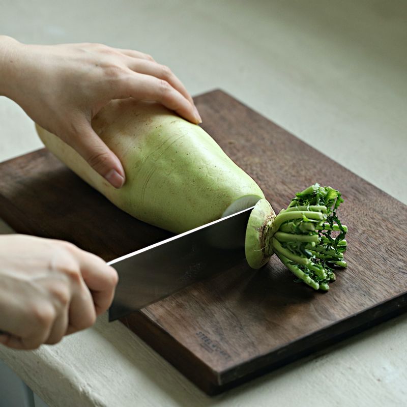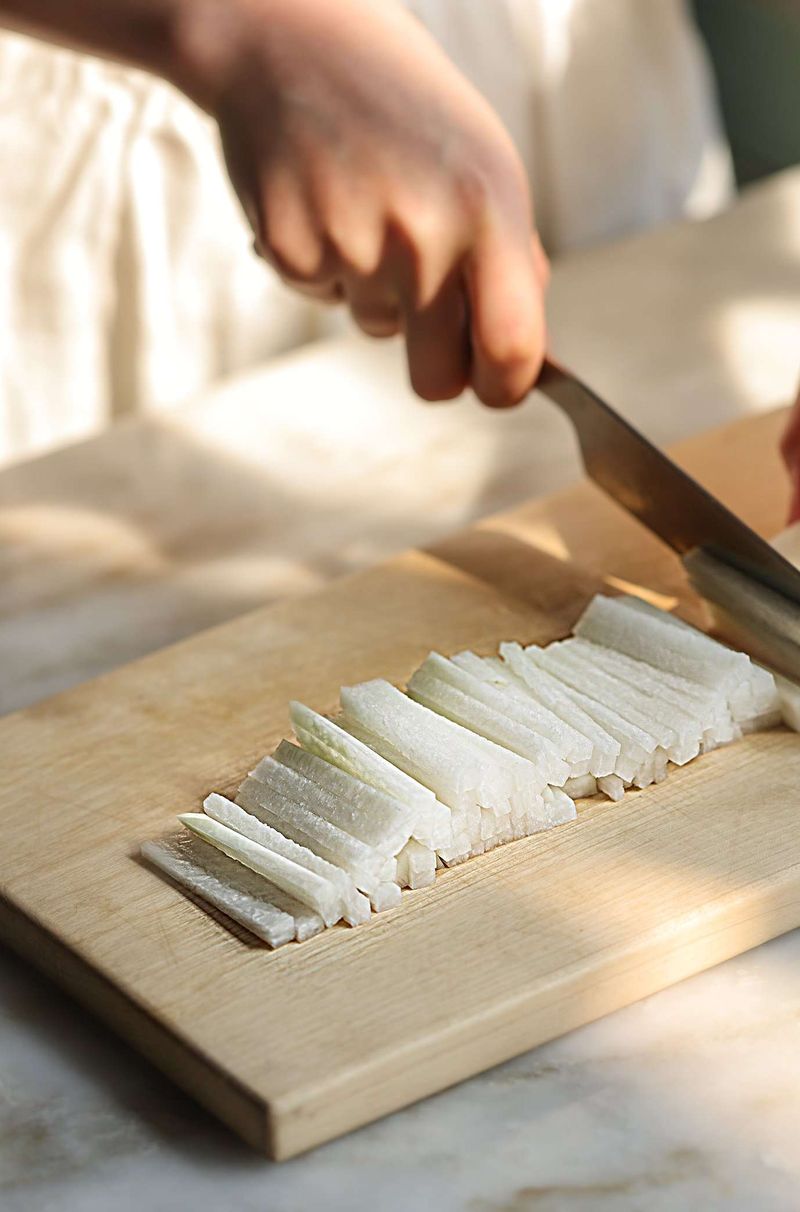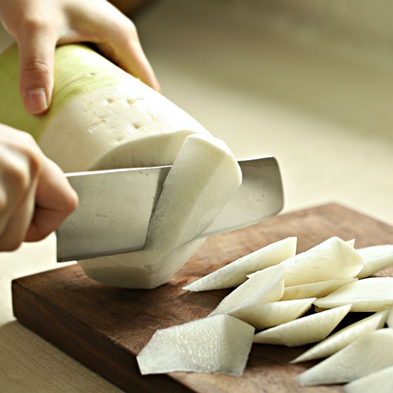 ① 무를 5-6cm 길이로 토막 내어 주세요. ② 토막 낸 무를 얇게 편 썰고, 가지런히 놓아 채썰어 주세요. ③ 무의 초록색 부분은 단맛이 강하고 단단해 나물이나 생채로 활용하기 좋아요. 2. 나박 썰기 ① 무를 1-1.5cm 두께로 썰어 주세요. ② 잘린 단면을 세로로 3-4등분 낸 뒤 0.5cm 이내 두께로 썰어 주세요. 3. 둥글게 깎기 ① 무를 1cm 내외 두께로 썰어 4등분 해 주세요. ② 무의 가장자리를 둥글게 깍으면 오래 익히는 찜 요리를 할 때 무가 부서지는 것을 방지해 줘요. 👇🏻더 많은 팁은 아래 링크를 클릭해 확인해 보세요!