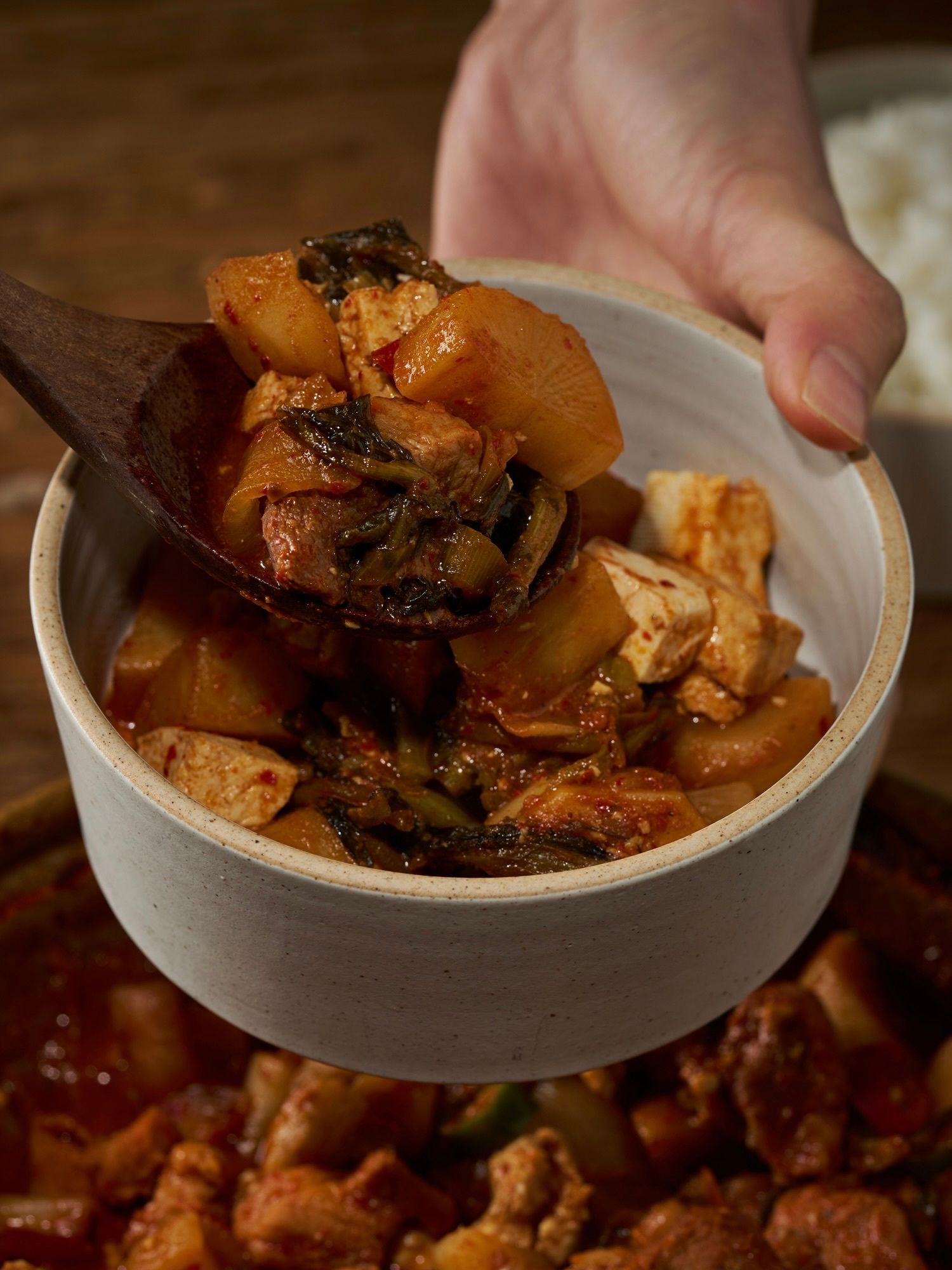 너무 익어버려 어떻게 먹어야 할지 처치 곤란이 총각김치가 잔뜩 있다면, 맛깔난 짜글이로 환생시켜 보세요! 감칠맛 가득한 김치에 두부와 돼지고기를 적절히 볶아내 맛이 없을 수 없는 조합이 탄생했답니다.
