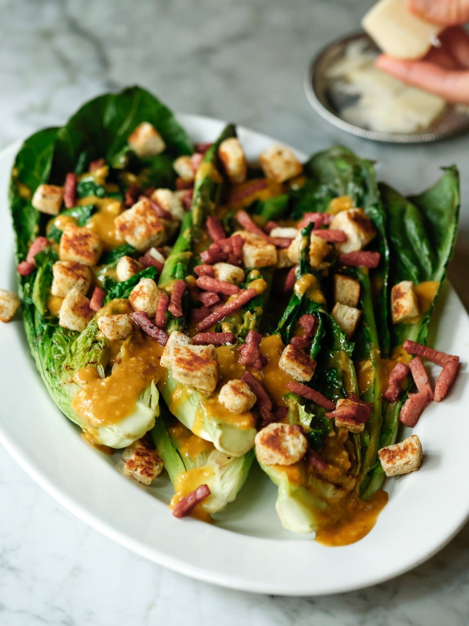 📝TIP 1. 엔초비가 없다면 멸치액젓을 활용해 드레싱을 만들어도 좋아요. 📝TIP 2. 기호에 따라 베이컨 대신 햄을 활용해 만들어도 괜찮아요. 📝TIP 3. 로메인 상추에 오일을 살짝 바른 후 오븐에 짧게 구워주면 더욱 맛있어요.
