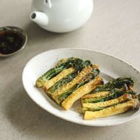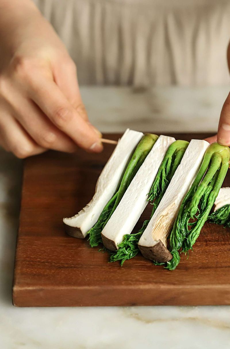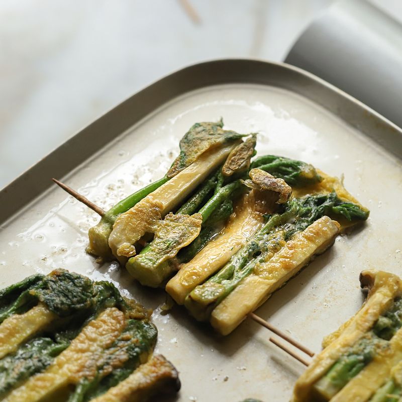 두릅에는 섬유질과 칼슘, 비타민이 가득 들어있어 건강에 좋다는 사실! 향긋한 식감이 매력적인 두릅과 새송이버섯을 꼬치에 끼워 노릇노릇 전으로 만들었어요.