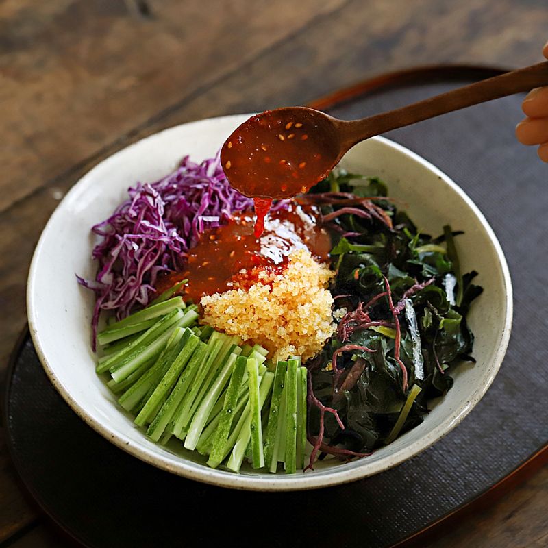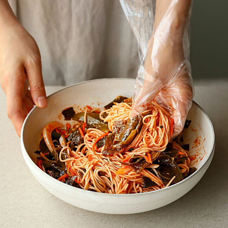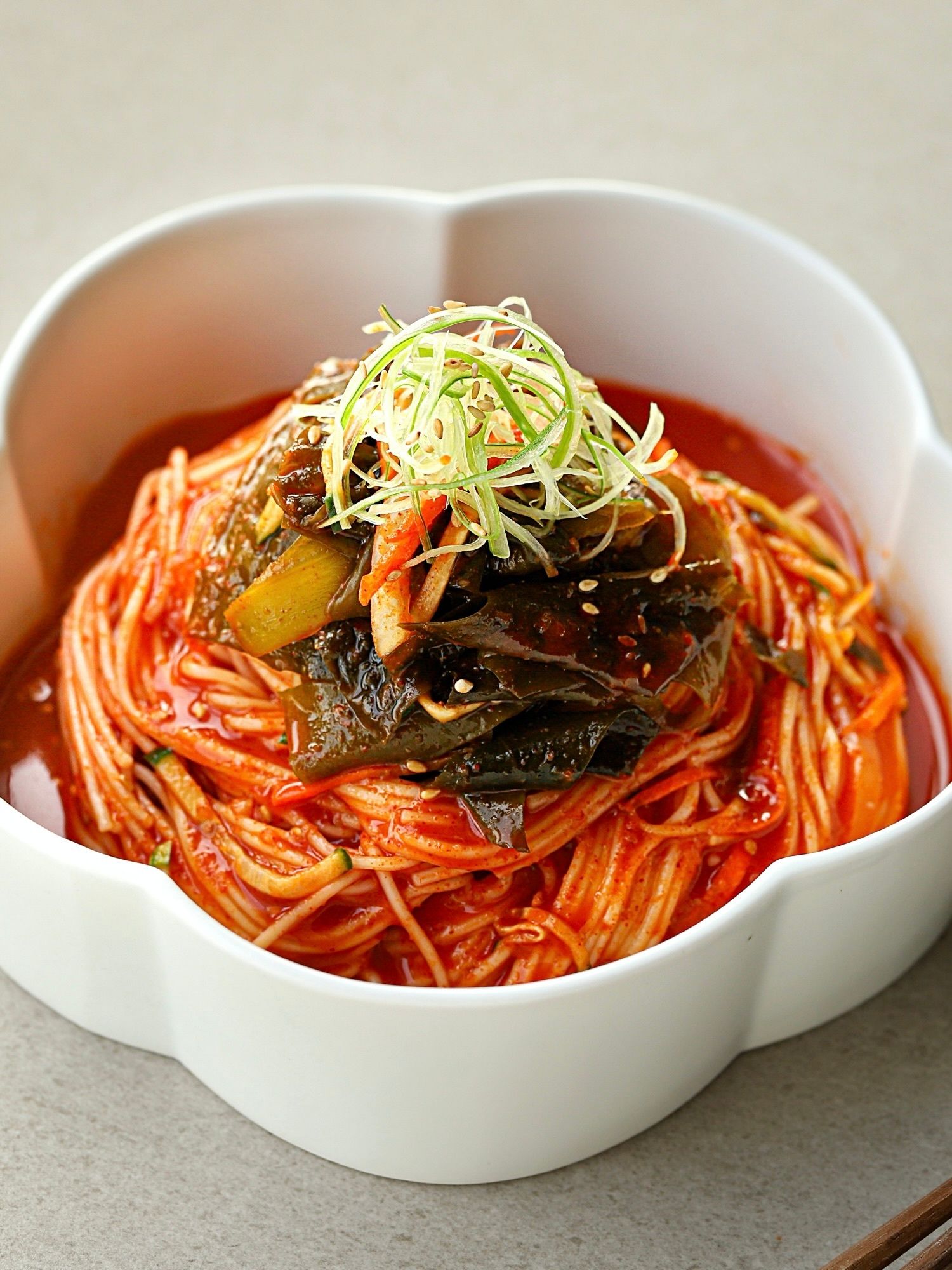 💡미역에는 단백질이 풍부하고 두피의 혈액순환을 도와 모발의 성장을 촉진하기도 한답니다. 매콤새콤하게 한 입 가득! 바다의 향이 한껏 느껴지는 미역 비빔국수 어떠세요? 그냥 먹어도 맛있는 비빔국수에 미역을 추가해 특별하게 즐길 수 있는 별미라 인기가 좋아요!