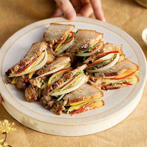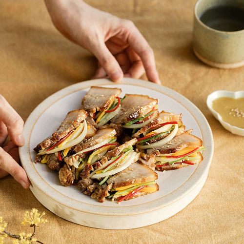 🥢🫑“눈까지 즐거운 알록달록 비주얼 보쌈” 두툼한 고기에 겨자 소스를 버무린 아삭한 채소를 올려 한 입에 쏘옥 먹는 보쌈! 파프리카의 색감이 입맛을 더욱 살려줘요. 간장 소스에 조린 수육과 새콤달콤 톡 쏘는 겨자 소스에 버무린 채소를 곁들이면 환상의 궁합을 느낄 수 있어요!