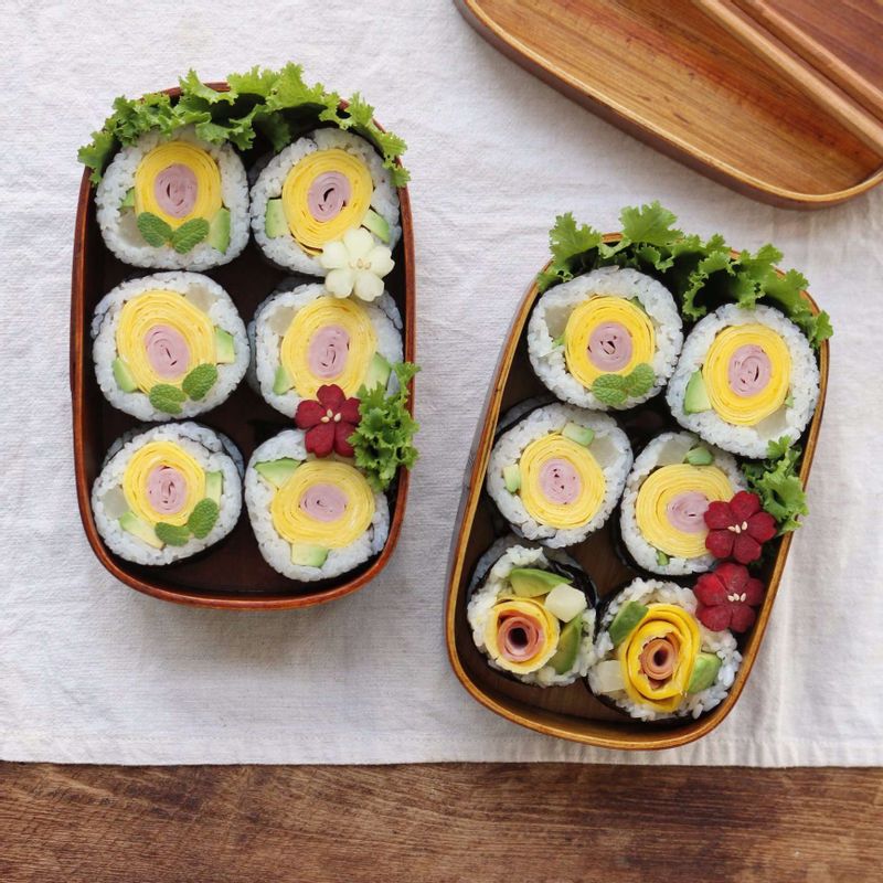 꽃 모양이 잘 안나올까봐 걱정하셨다면 그 걱정 넣어두세요! 생각보다 모양이 잘 나와 기분까지 좋아진답니다? 많은 김밥 재료 필요없이, 달걀, 햄, 아보카도 만으로 예쁜 소풍 도시락을 만들 수 있어요. 특히 아이 도시락으로 인기만점! 📝TIP 1. 아보카도가 없다면 소금에 살짝 절인 오이를 넣어 만들어주셔도 좋아요.