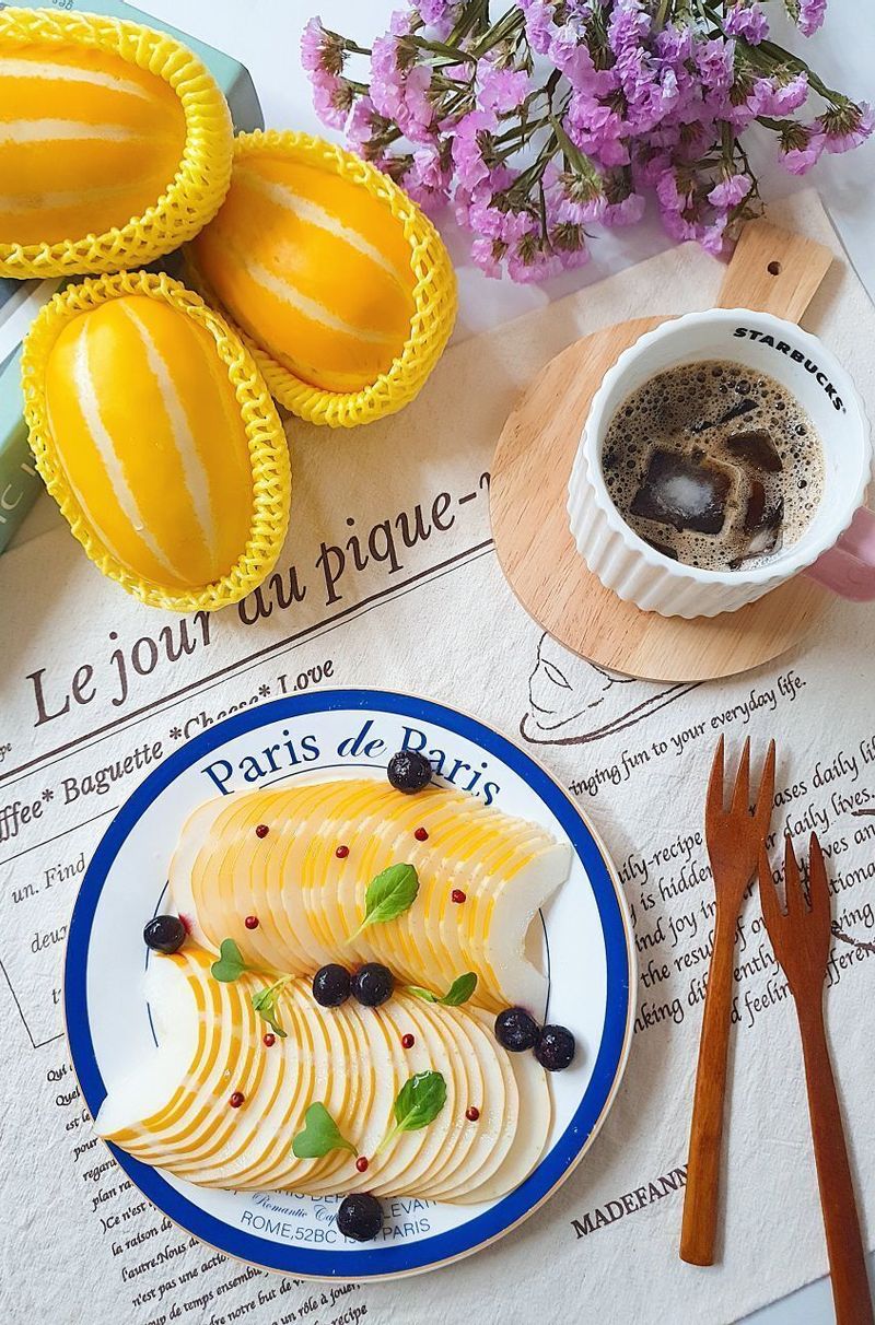 ⏰요리 시간 : 10분 SNS에서 한 번쯤 보셨을 거예요. 참외로 이렇게 고급스러운 비주얼이 가능하다고? 싶으셨죠~ 과일로 먹던 참외를 조금의 정성을 들여 예쁘게 썬 다음 집에 있는 재료로 드레싱 만들어 뿌려주기만 하면 끝! 📝TIP 1. 보통 레몬즙 대용으로 식초를 사용하기도 하지만, 과일 샐러드에는 꼭 레몬즙을 사용해야 특유의 상큼함이 살아요. 📝TIP 2. 치즈까지 흩뿌려 주면 풍미도 살아나면서, 와인&맥주 안주로도 손색 없답니다.