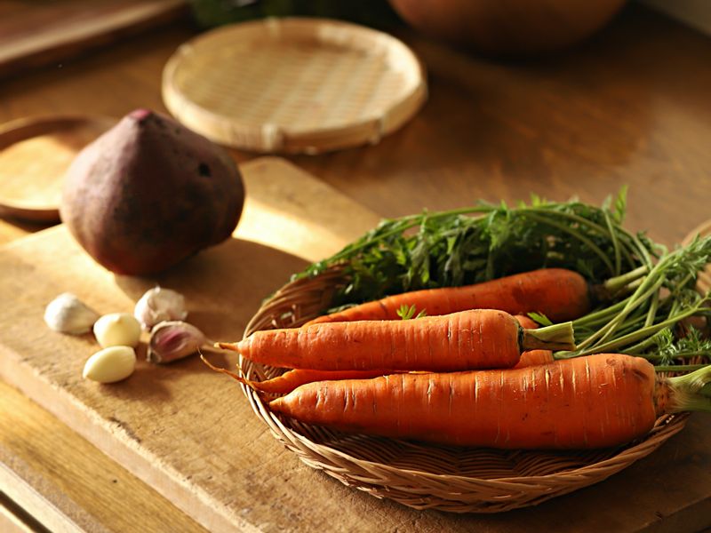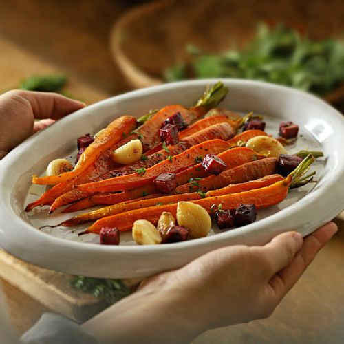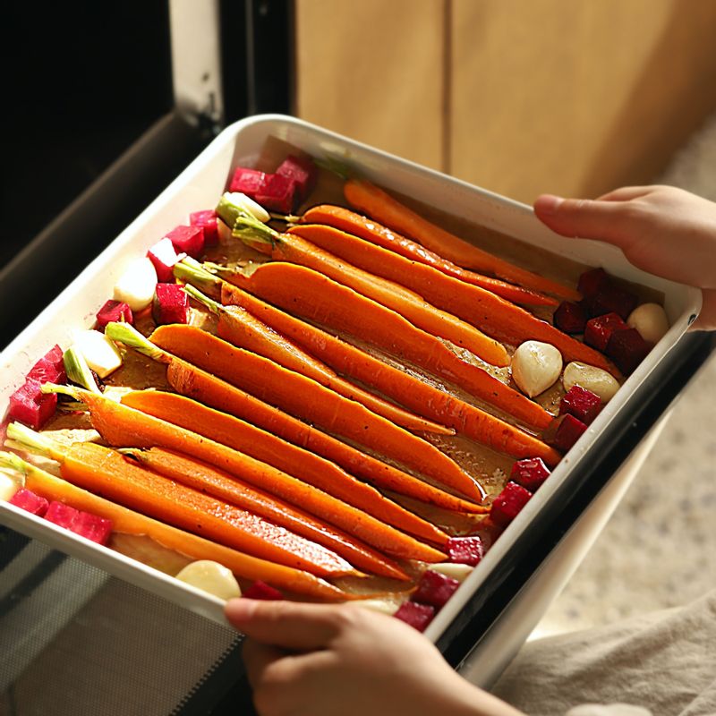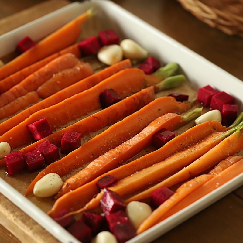 냉장고 속을 자세히 들여다보세요. 요리를 위해 장 본 채소가 한가득 있을 텐데요. 그중 채식 요리에 사용할 채소들은 뿌리채소입니다. 겨울이 제철인 뿌리채소는 다른 채소보다 맛이 달고 비타민이 가득해 구워 먹는 것을 추천합니다. 당근, 비트, 마늘 등 냉장고 속 뿌리채소를 깨끗하게 씻고 오일 시즈닝에 버무려 에어프라이어 혹은 오븐에 구우면 쉽게 끝이 납니다. 달걀, 유제품, 꿀 등 동물에서 얻은 재료가 없어 완전한 식물성 식품만 먹는 비건도 맛있게 즐길 수 있는 채식 요리입니다.