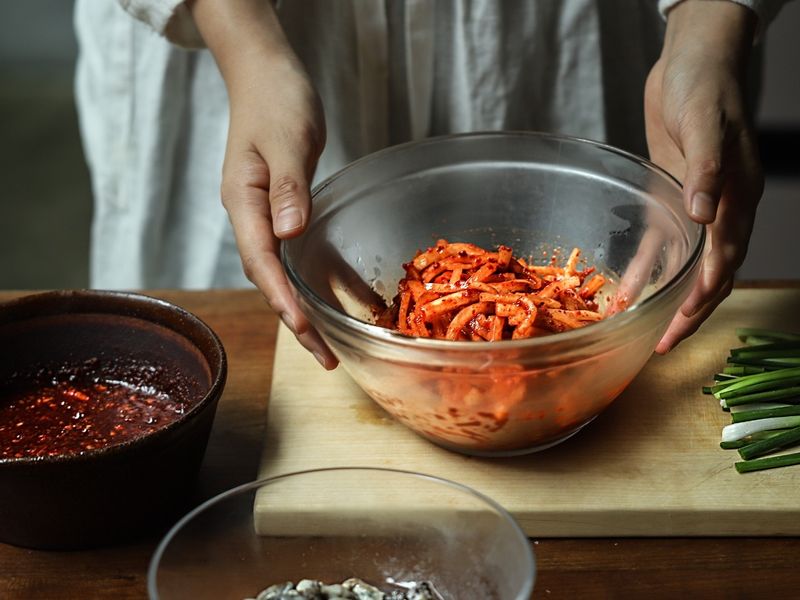 - 🍯요리꿀팁 하나. 굴은 옅은 소금물에 살살 헹군 후 체에 밭쳐 물기를 제거해 주세요. 🍯요리꿀팁 둘. 무채는 굵은 소금에 10분간 절였다가 물기를 제거해 주세요. 이렇게 해줘야 비린 맛도 잡고, 굴맛이 변하는 걸 막을 수 있어요. 절인 무채는 특유의 아삭하고 꼬독한 식감을 살릴 수 있답니다.