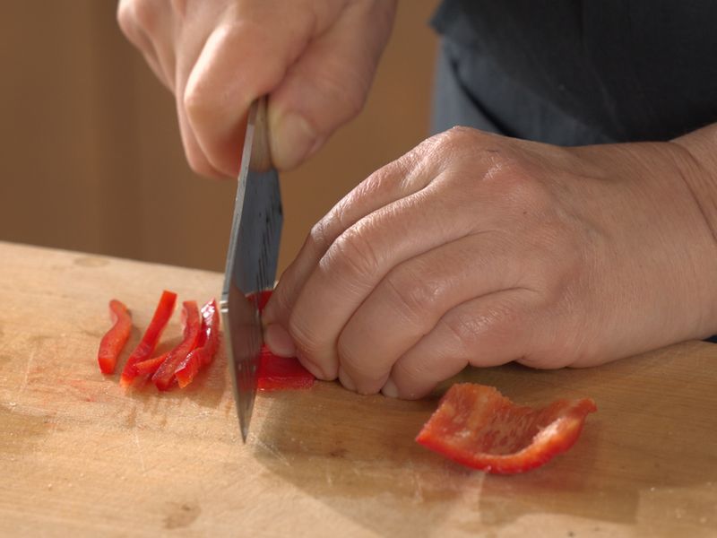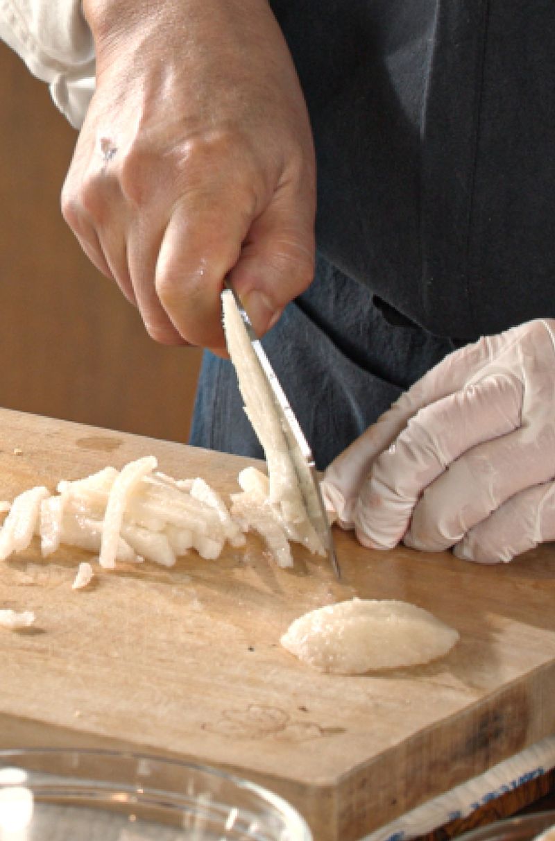봄 채소 영양솥밥의 핵심 재료, 우엉. 우엉은 껍질에 영양소가 많은데요. 껍질에 있는 영양소를 섭취하려면 이렇게 썰어주세요! 📝TIP 1. 연필을 깎듯이 우엉을 쥐고 칼을 세워서 얇게 썰어주세요. 칼등이나 솔로 껍질을 살짝 긁어내는 정도로 손질해 주세요.