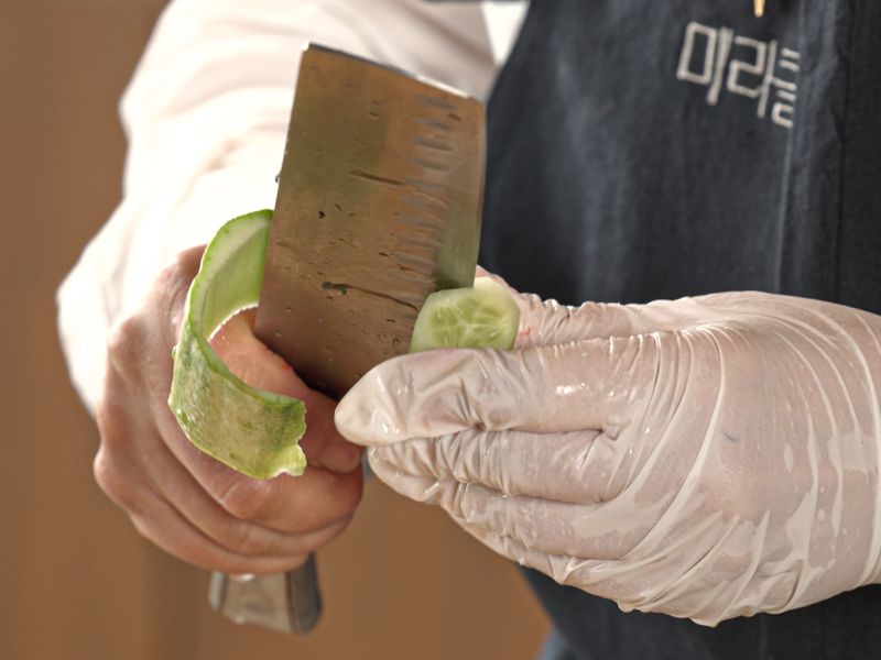 아롱사태 해파리냉채를 만들 때 필요한 오이 돌려깎는 방법을 알려드려요. ❶ 오이의 가시부분을 필러로 긁어내주세요. ❷ 오이를 5센치 길이로 등분하고, 가운데 씨 부분이 나오기 전까지 돌려 깎아주세요. ❸ 돌려 깎은 오이를 겹쳐서 얇게 채썰어 주세요. 더 상세한 내용은 '자세히 보기' 버튼을 눌러 영상을 참고해 주세요!