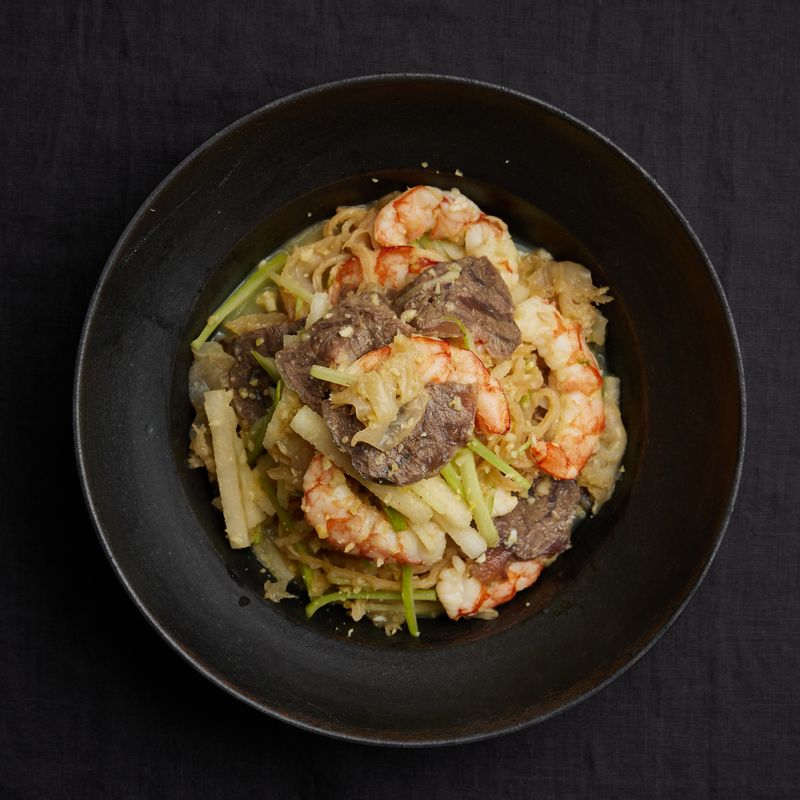 우리가 흔히 맛보았던 해피리냉채를 완전히 잊게 만드는 레시피예요. 아롱사태와 새우가 들어가 골라먹는 재미가 더해지고, 특제소스와 킥 재료까지 추가되어 다채로운 맛을 지녔어요! 재료 손질팁을 참고해 더욱 완성도 있는 레시피로 즐겨 보세요. 📝TIP 1. 오이 가운데 씨부분은 쓰지 않아요. 📝TIP 2. 배는 최대한 넓은 단면이 나올 수 있도록 썰어 일정한 크기로 썰어주세요. 📝TIP 3. 아롱사태는 물을 두 번 정도 교체하며 15분 정도 핏물을 빼주세요. 냄비에 아롱사태와 찬물을 넣고 대파 한 뿌리, 다시마 한 장을 넣고 서서히 끓여주세요. 물이 끓으면 다시마를 건져내고 총 1시간 삶아주시면 돼요.