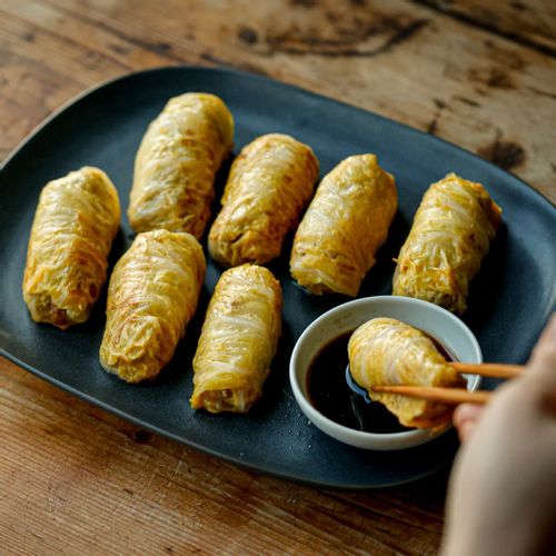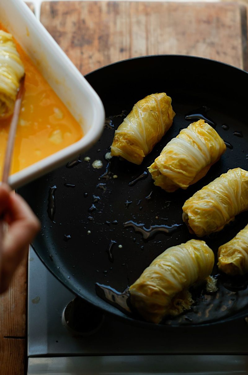 여기서 끝이 아니에요! 배추롤에 달걀물을 입혀 노릇노릇 구워내면 더욱 고소해요. 부대끼는 것 없이 속 편하게~ 가벼운 저녁 메뉴로 추천드릴게요!