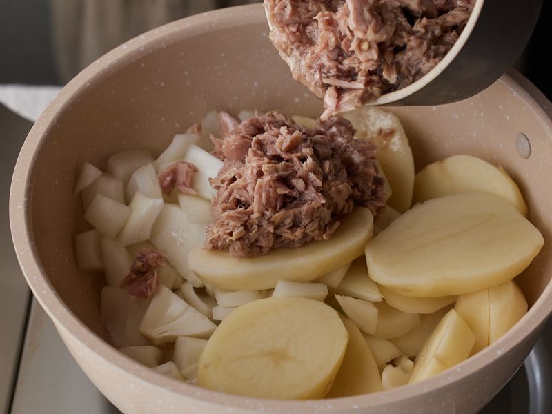 매콤짭조름한 요 반찬 하나면, 밥이 술술 들어가요. 부드러운 감자와 담백한 참치에 매콤한 양념을 넣어 자작하게 끓여냈답니다. 참치기름으로 볶아 감칠맛이 더욱 좋아요.