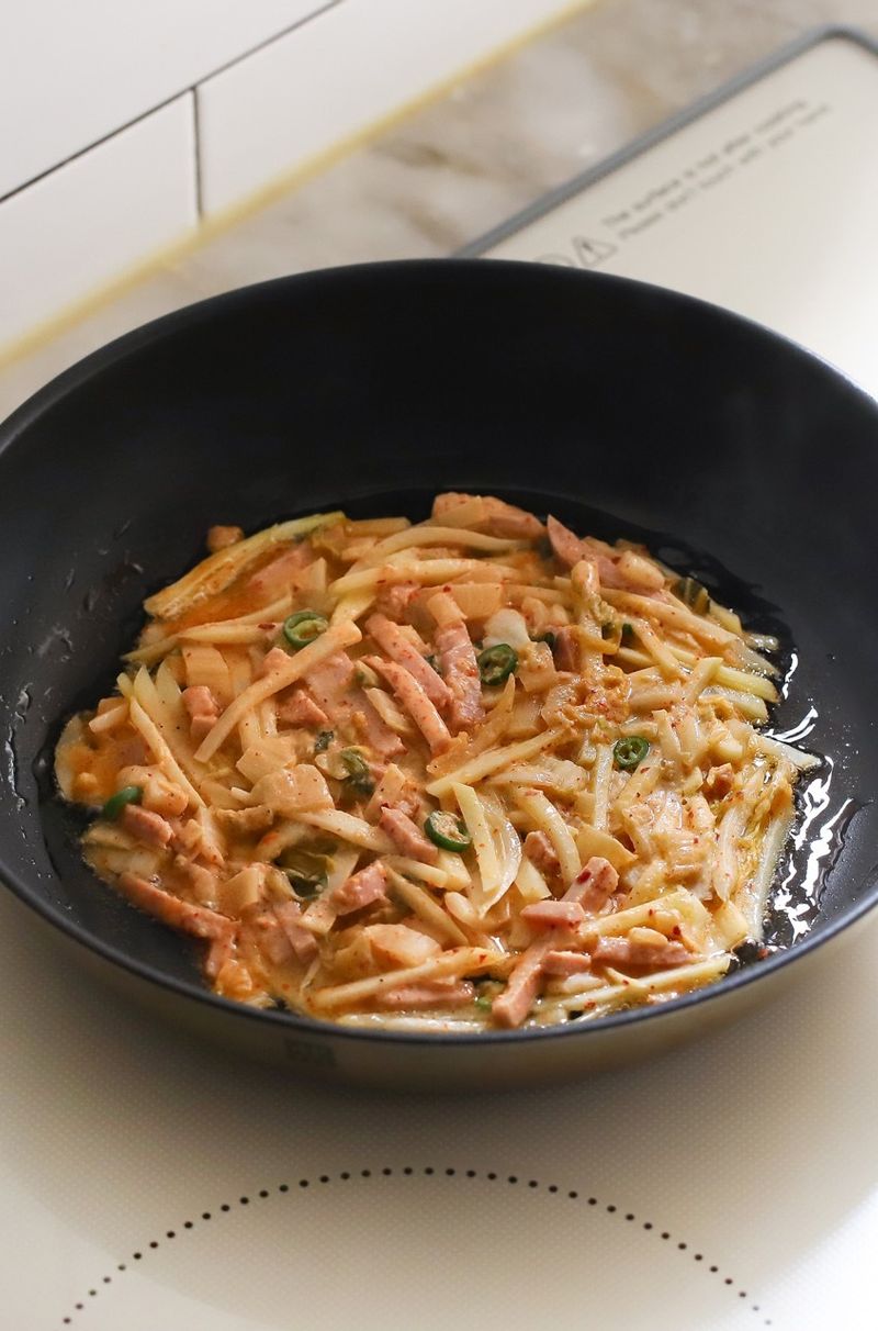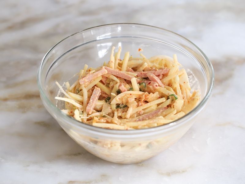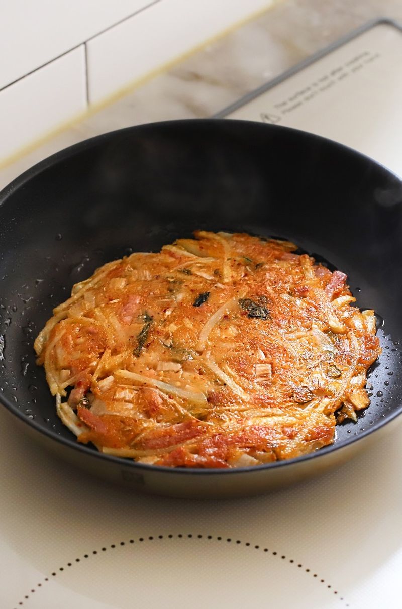이건 뭐 재료부터 치트키인 감자와 햄까지 더해진 김치전이라니, 맛이 없을수가 없겠는데요! 김치의 아삭한 식감과 감자, 햄의 부드럽고 고소한 맛까지 추가되어 어른 아이할 거 없이 좋아할 만한 메뉴예요. 우중충한 날씨에 기분전환용으로 먹기에도 딱!