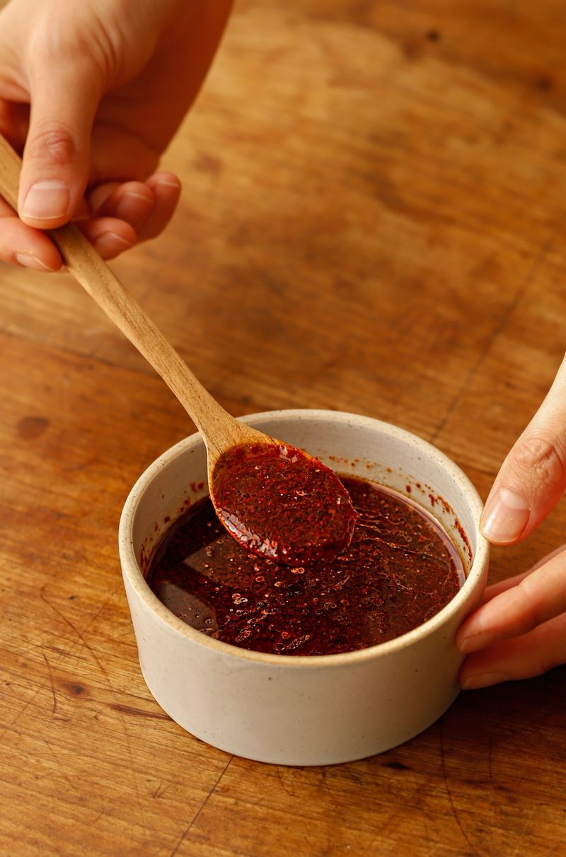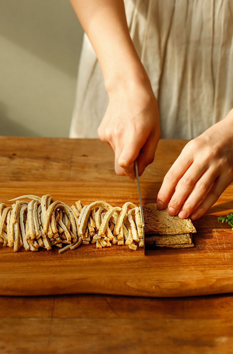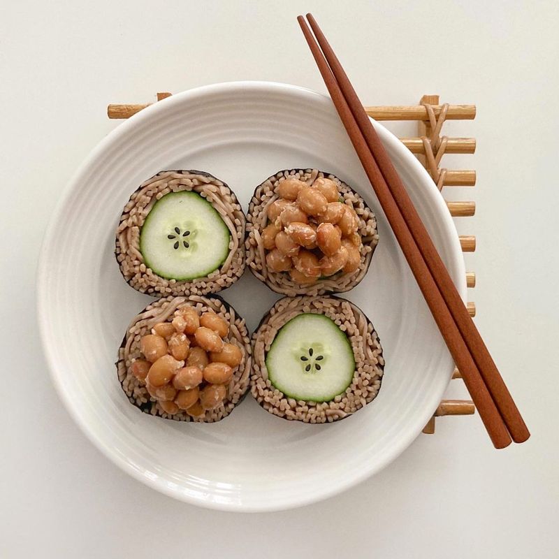 비건 쯔유로 양념한 메밀면에 통오이 넣어 돌돌 말은 후 낫또처럼 생으로 먹는 청국장을 얹었어요. 비건 요리를 즐기신다면 한 번쯤 도전해 보세요!