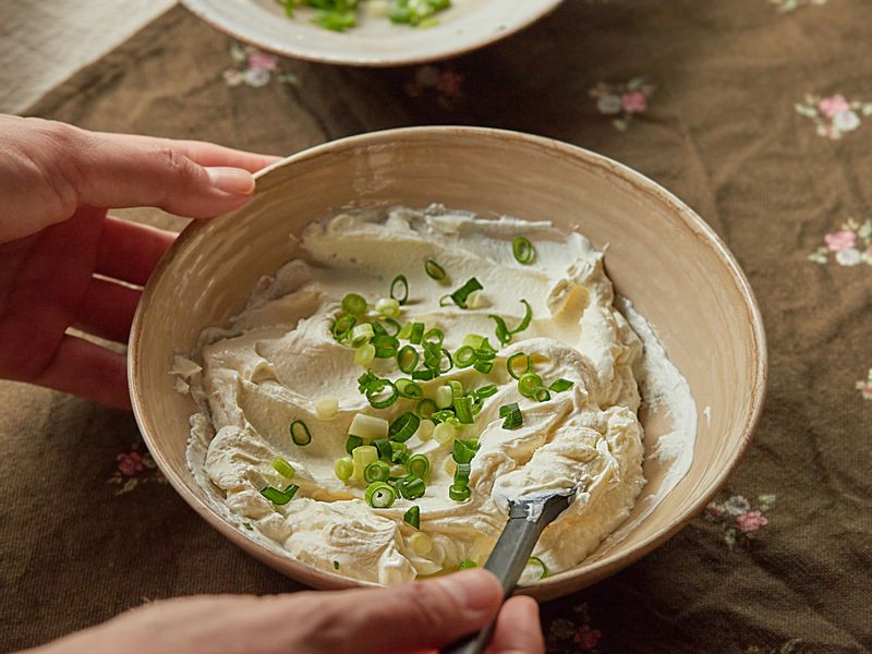 그릭요거트 베이글을 마지막 한 입까지 질리지 않고 맛있게 먹는 포인트는 바로 쪽파와 청양고추! 쪽파와 청양고추의 아삭함과 그릭요거트의 꾸덕한 식감이 정말 잘 어울려요. 중간중간 느껴지는 청양고추의 알싸함이 느끼함을 확 잡아준답니다.