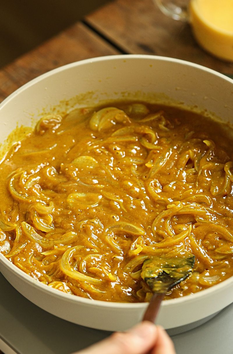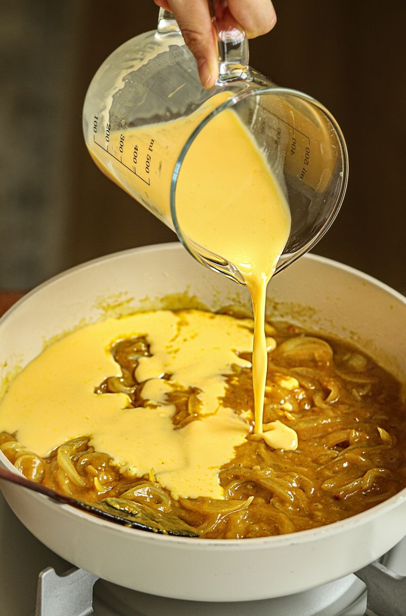 감자, 당근 등 기본적인 재료 손질도 귀찮을 때 있으시죠? 마늘과 양파로만 맛을 내고, 카레 소스에 달걀을 넣어 뭉근하게 끓여 냈어요. 별다른 재료 없이도 간단하고 맛있게 만들어 먹을 수 있는 초간단 카레 요리! 부드럽게 술술 넘어가 딱히 먹고 싶은 음식이 없을 때 한 끼로 손색이 없답니다.