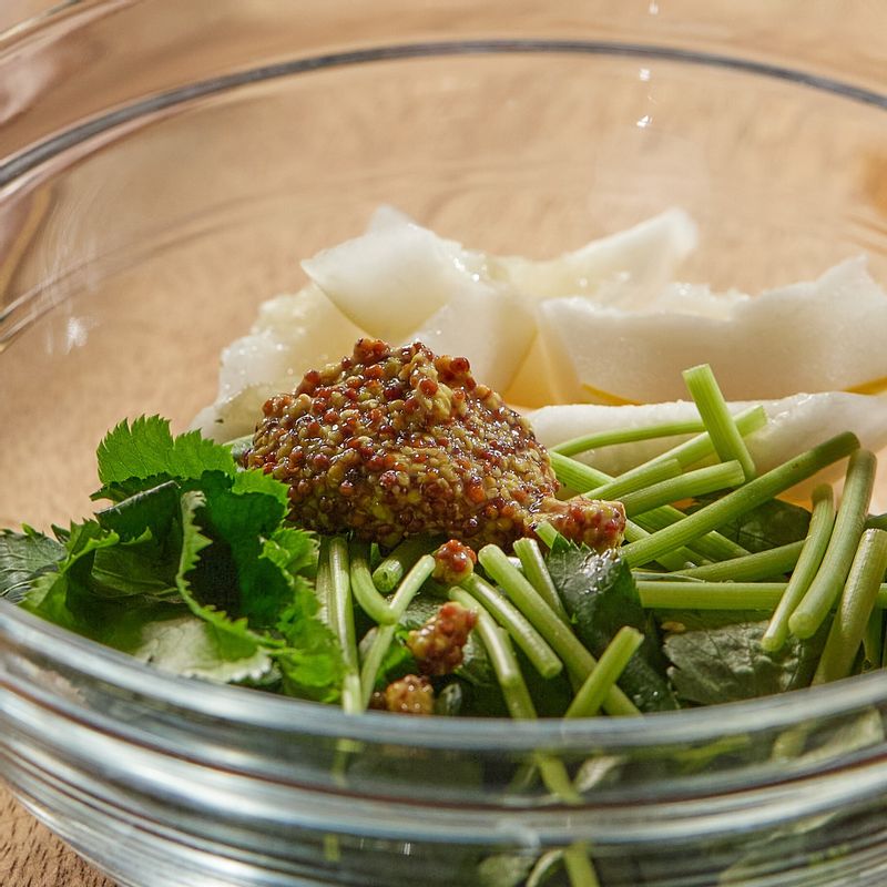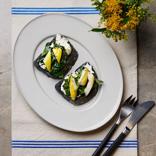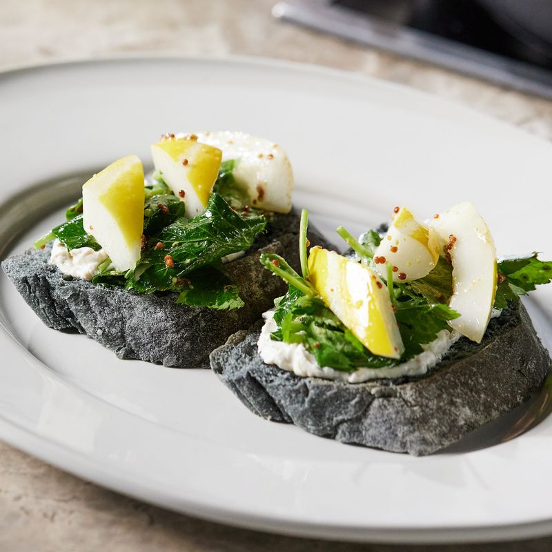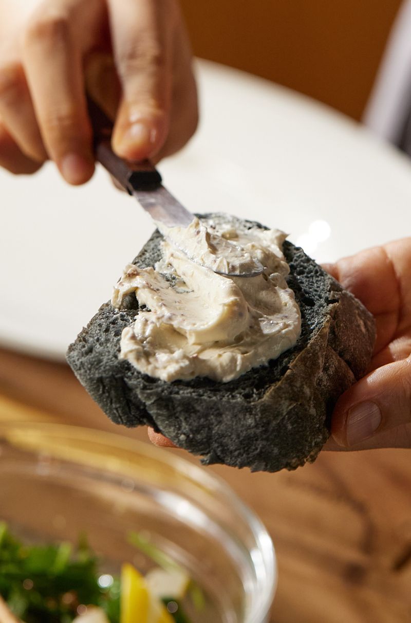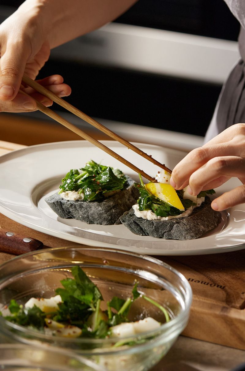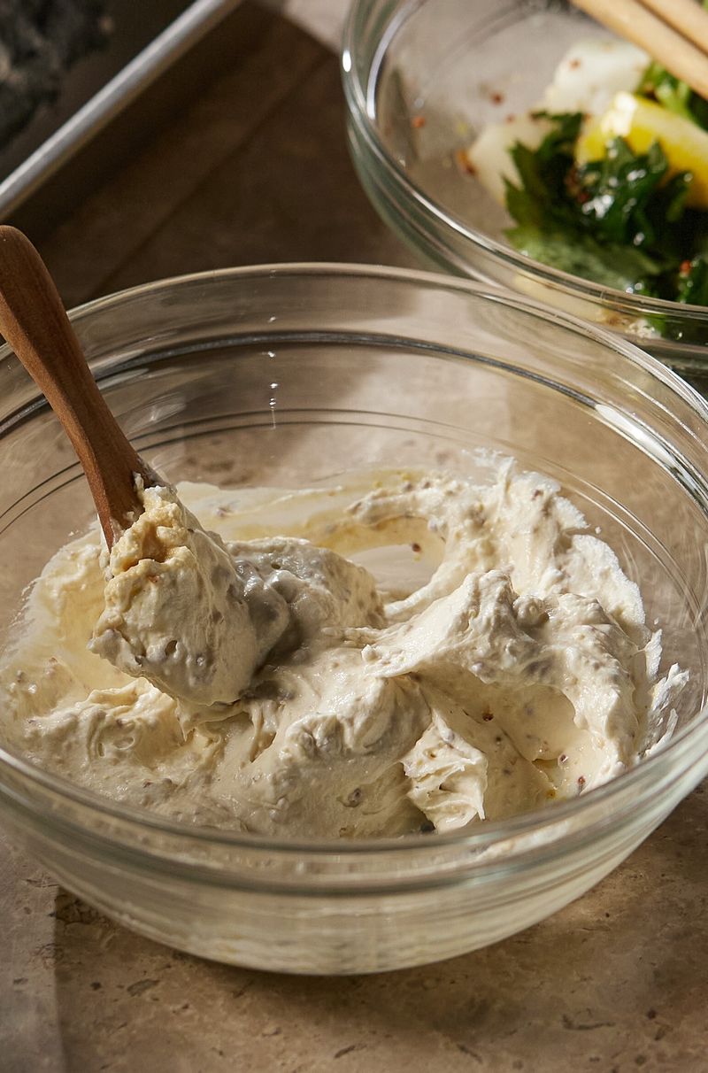 잘 구운 치아바타 빵 위에 홀그레인 머스타드와 매실청으로 풍미를 더한 그릭요거트를 가득 얹으면 정말 잘 어울려요. 📝TIP 2. 그릭요거트에 매실청을 넣고 섞어주면 부드러워져서 빵에 바르기 편하답니다.
