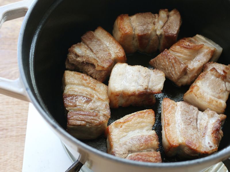 보통 구워 먹는 삼겹살을 부드럽게 삶아 달큰하고 짭조름한 간장 소스에 오래도록 졸여냈어요. 다른 반찬 없이도 삼겹살 간장조림 하나면 오늘 저녁 한 끼 맛있게 해결이랍니다!