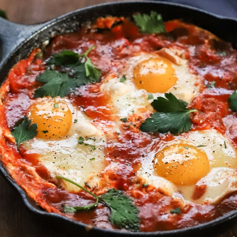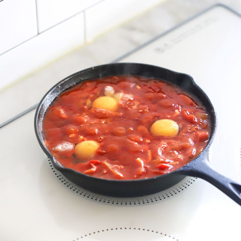 📝TIP 1. 취향에 따라 달걀의 익힘 정도를 조절해 주세요. 빵과 함께 먹는다면 반숙으로 드시는 것을 추천해요. 📝TIP 2. 토마토소스를 직접 만들어 다이어트 식단으로 즐기기에도 좋아요. 통밀빵과 함께 즐겨주세요.